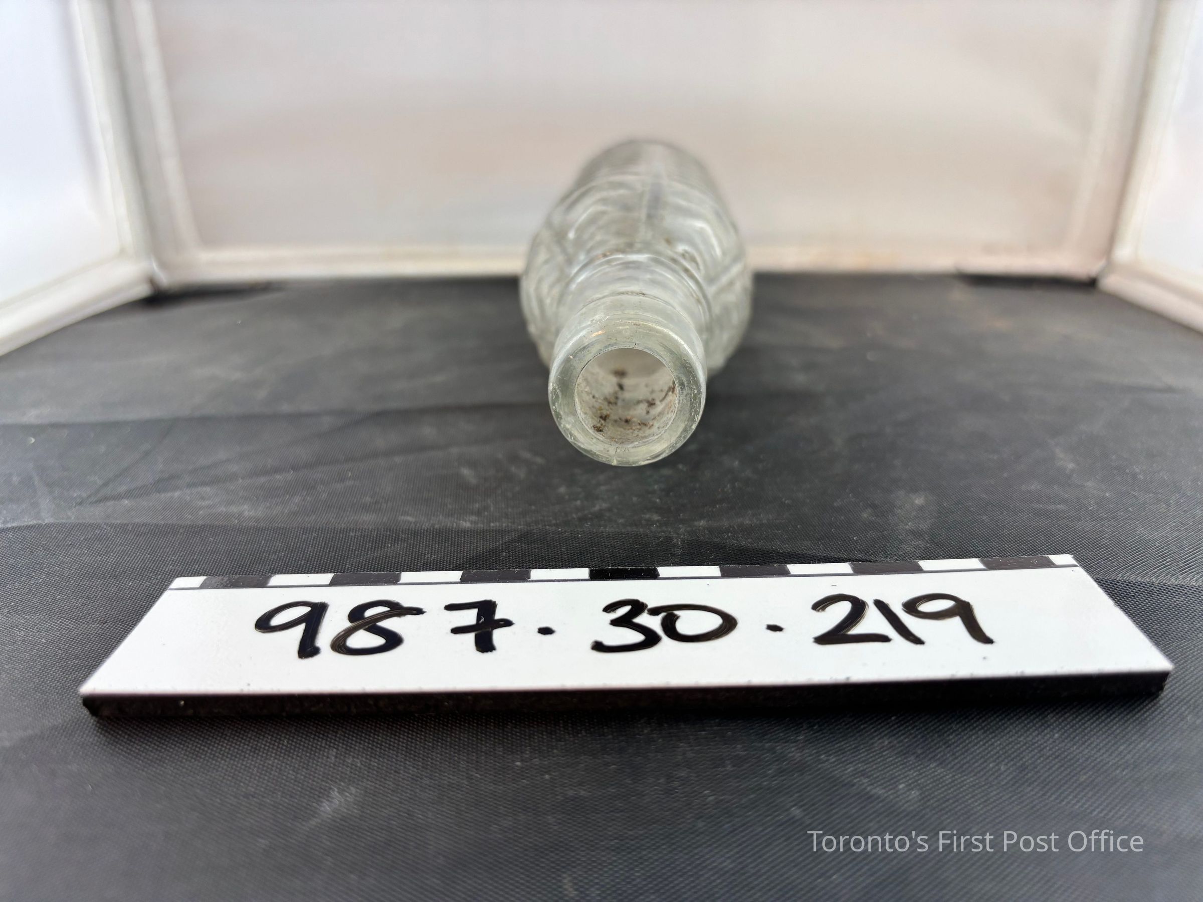 Bottle; clear glass; herringbone design in glass between six vertical lines; inscription: "ORANGE DELIGHT", "Design Regd May 7/25", "Contents 7 Fl.oz", "S.W. MFG. Co. ONT."; circa 1925; excavated from Cumberland addition 1981.Dimensions