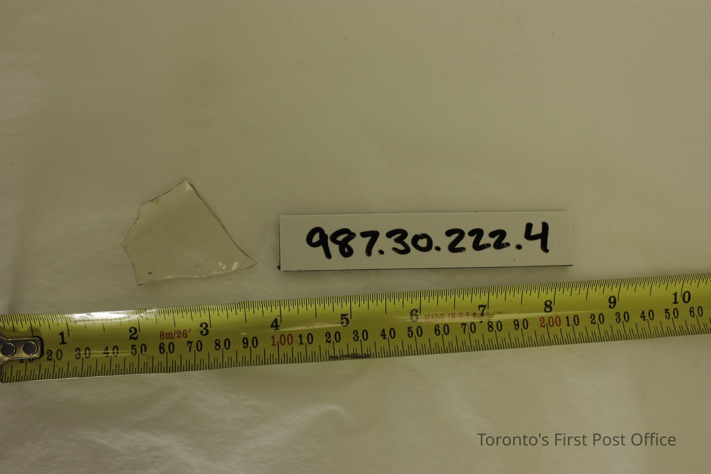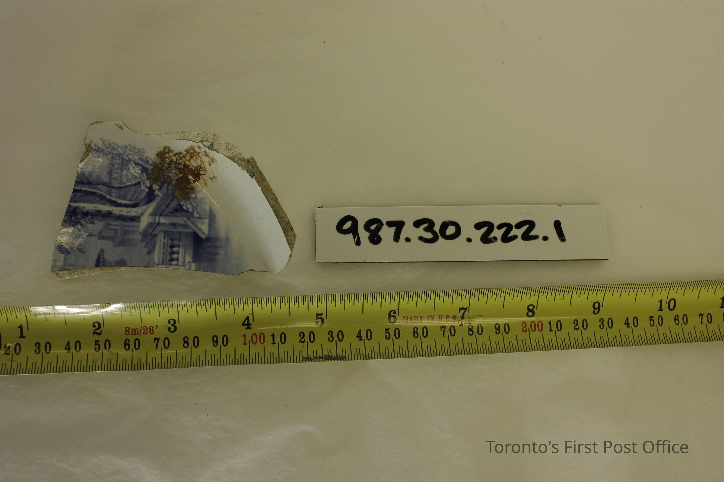 Five shards of pottery; irregularly shaped; blue willow design in one large shard; white and blue glaze; excavated beside north-west corner of Cumberland addition.Dimensions