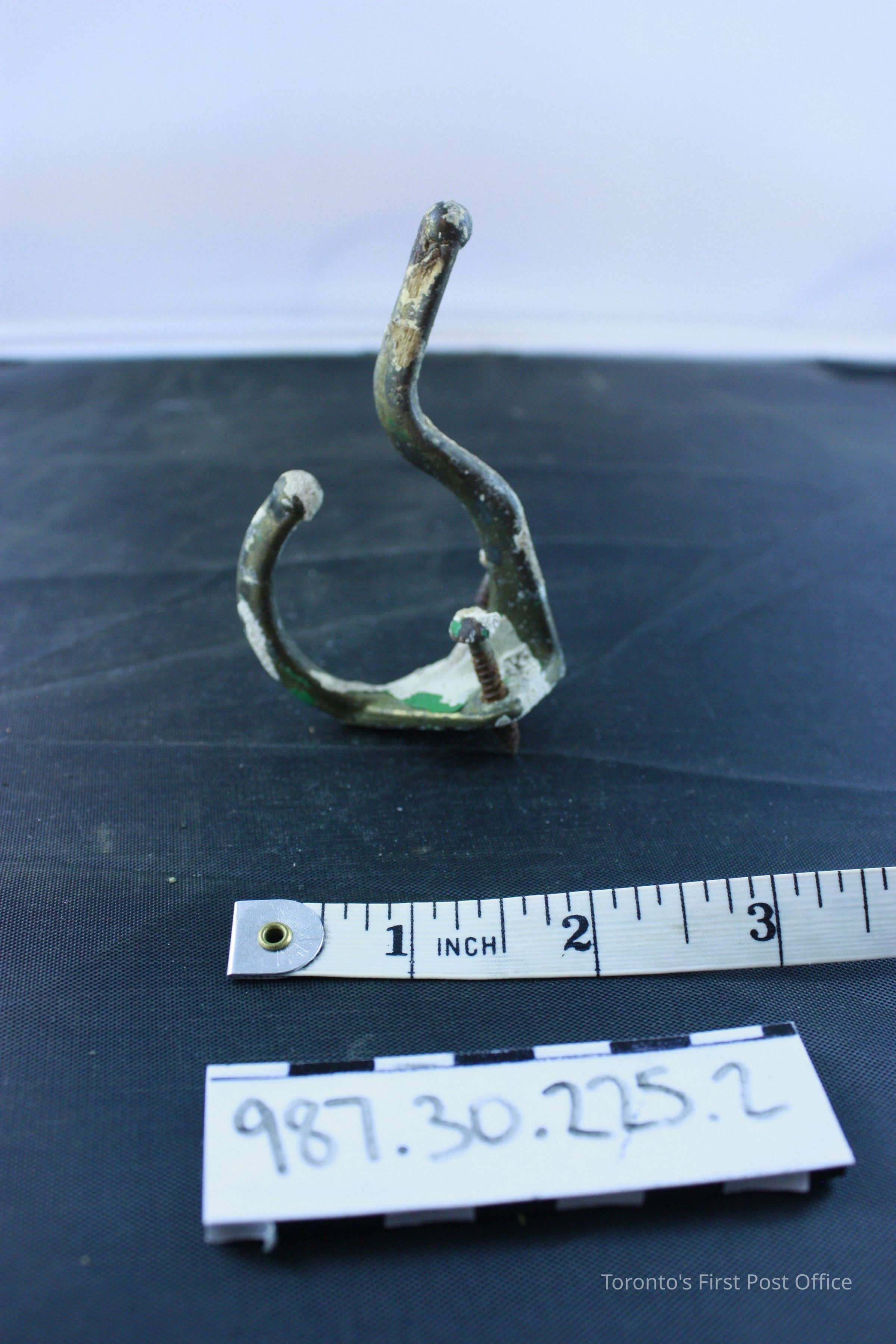 Brass coat hook; triangular back plate; two screw holes at top to attach to wall; screws still attached; two hooks; circa 1900.