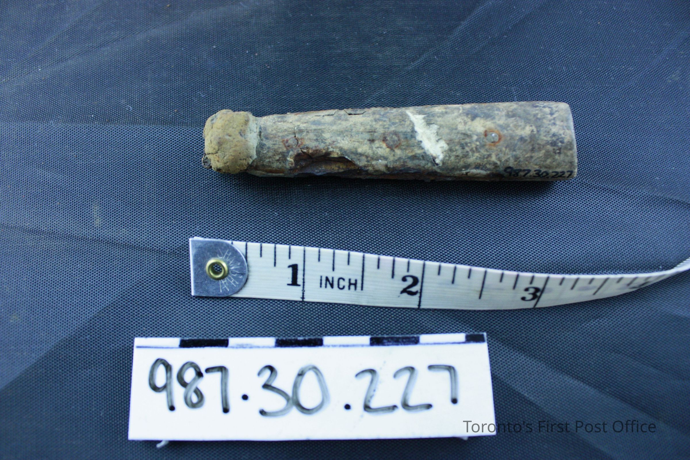 Bone knife handle; mottled beige, brown, and yellow; metal knife broken off at base (still inside handle); circa 1835; excavated from south wall of Bank of Upper Canada building, west of portico.Update Date