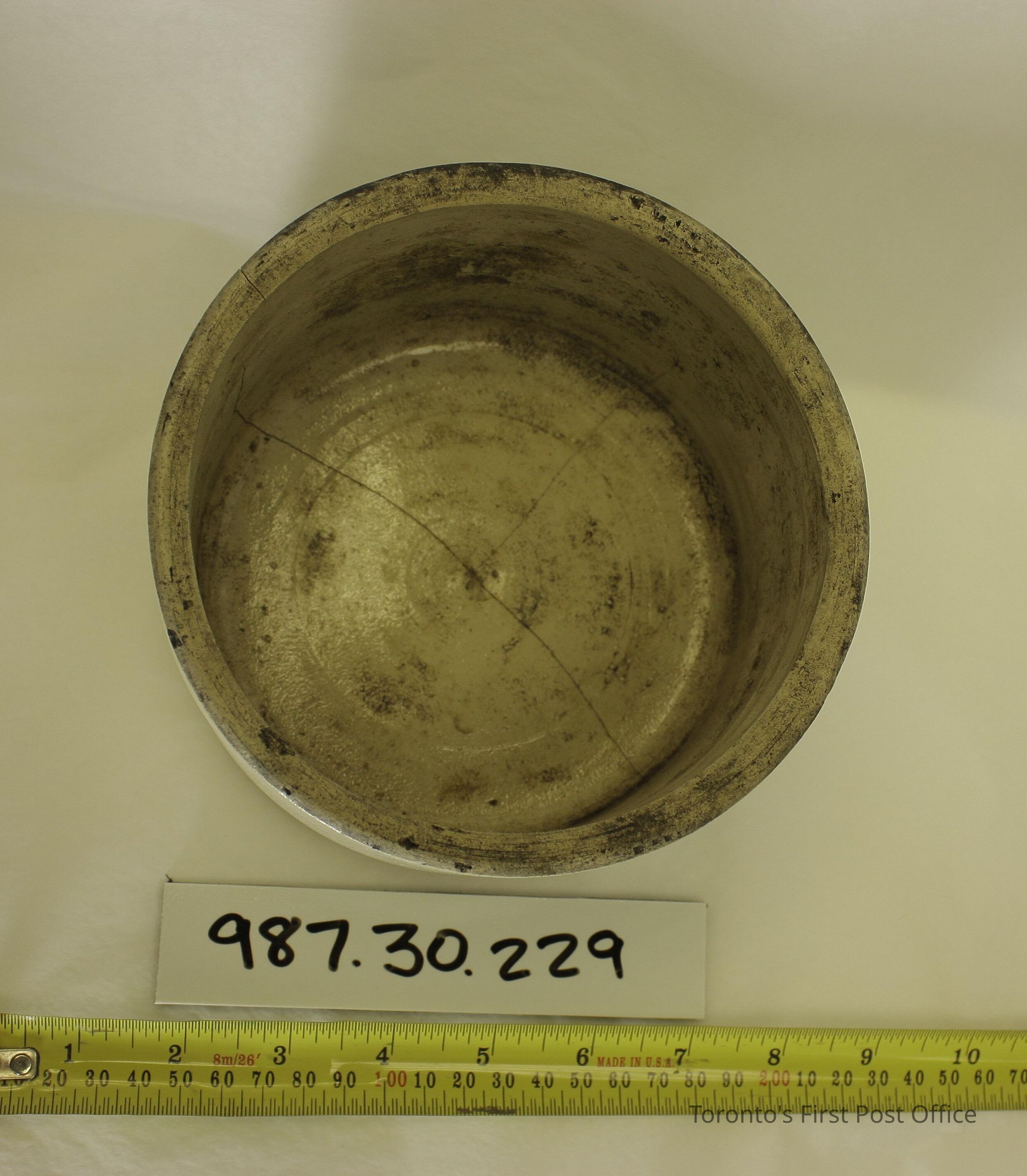 Clay crock with beige glaze; circa 1885; excavated from basement of De La Salle building, 1980.Dimensions