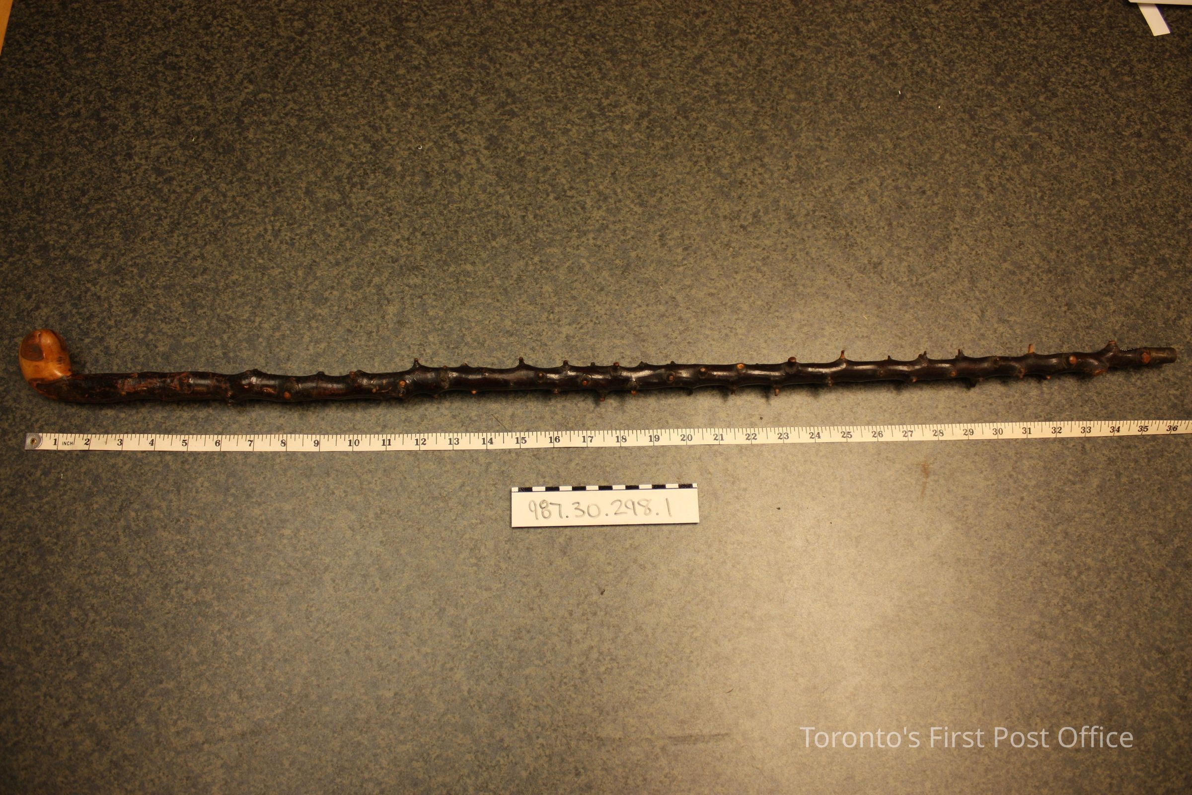 Walking stick; hawthorn; knotholes; many small branches protruding from stick; black.