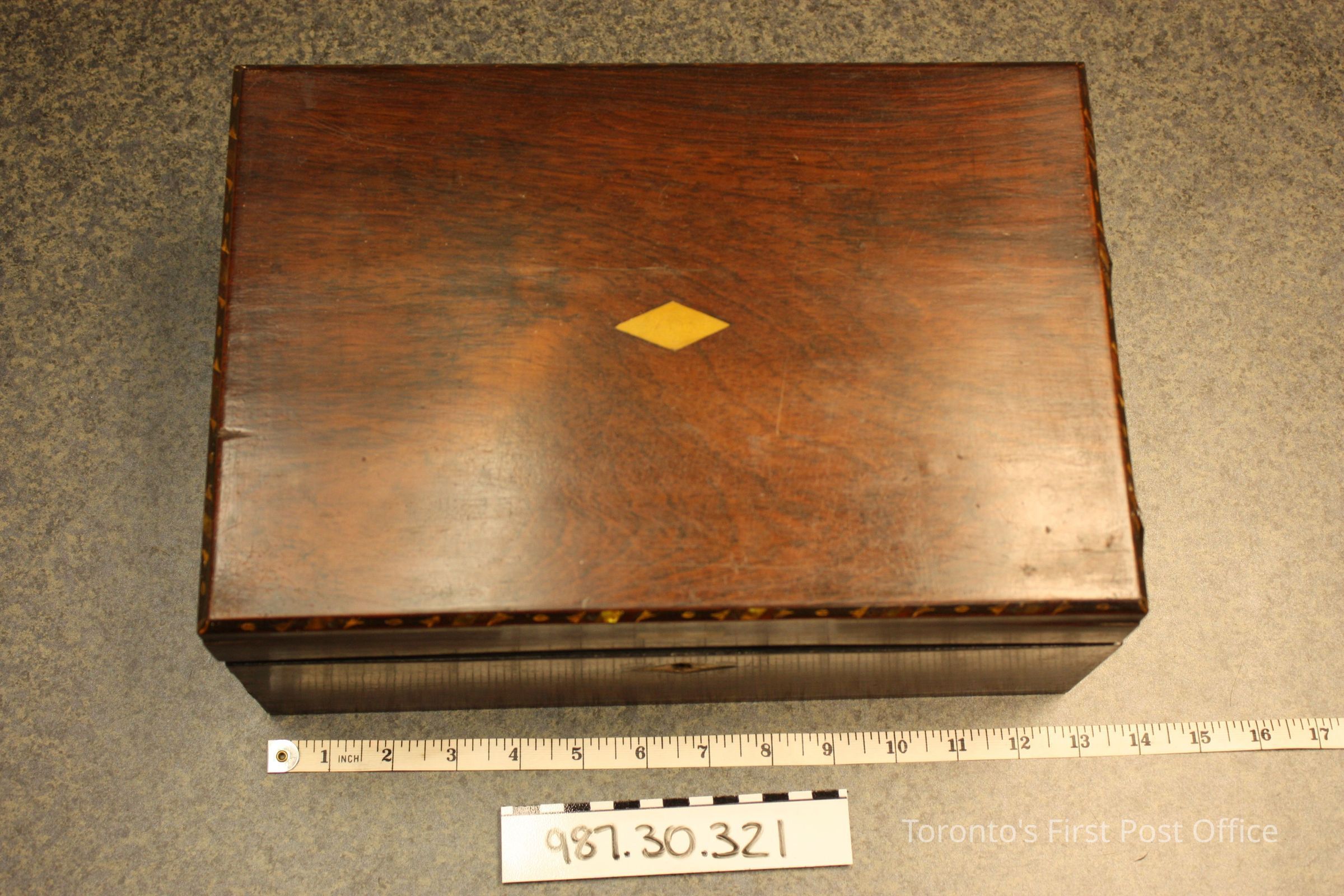 Writing box/lap desk; rosewood veneer; edges inlaid with abalone and gilt paint; contains: diamond-shaped brass cartouche (from front), three metal keys, corked inkwell, four pieces of red sealing wax, one goose quill.Dimensions