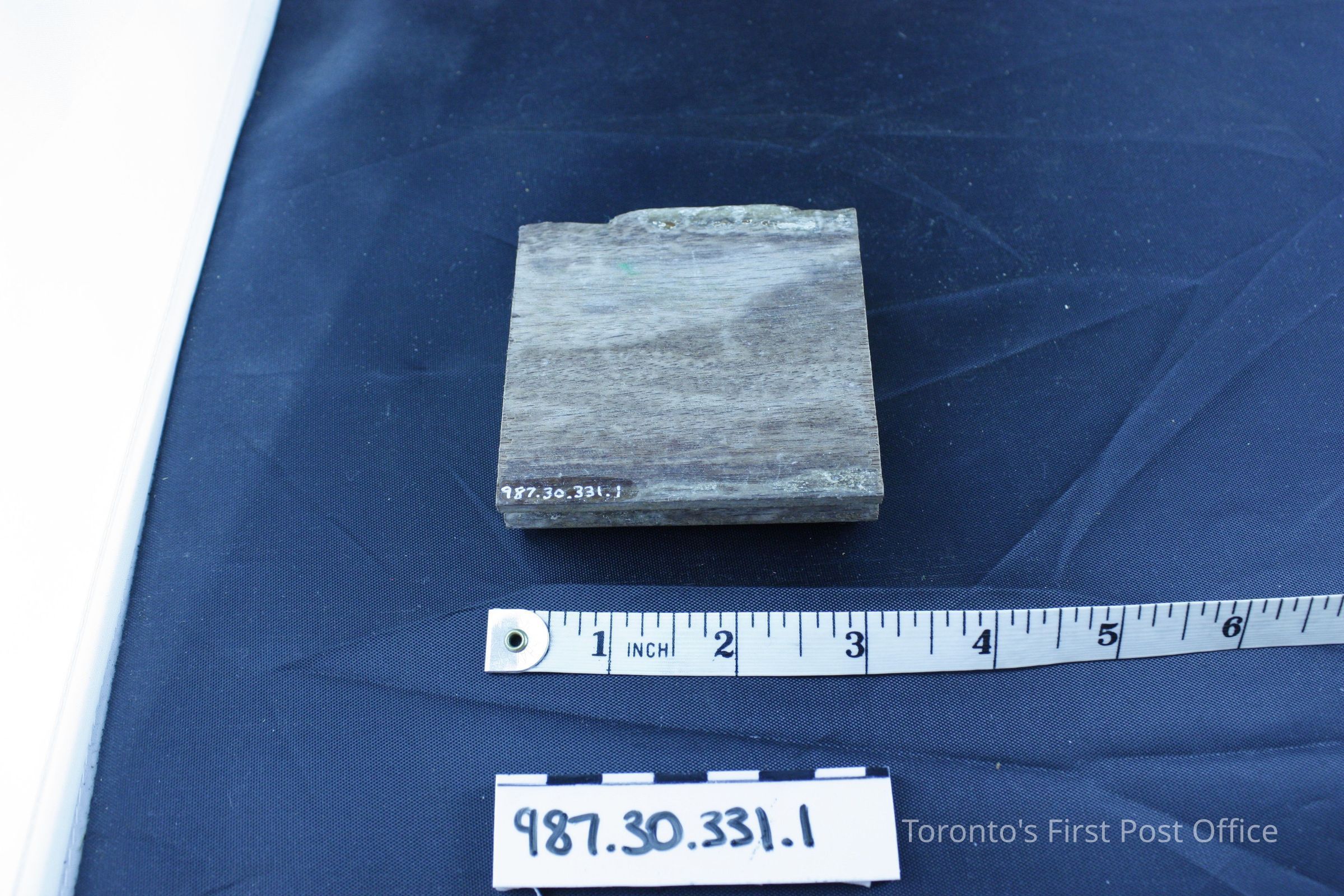 .1: Wooden moulding, brown stain; .2: Wooden dowel; natural wood; some brown stain and paint; flattened along one side; both are originally from floor of Bank of Upper Canada.Dimensions
