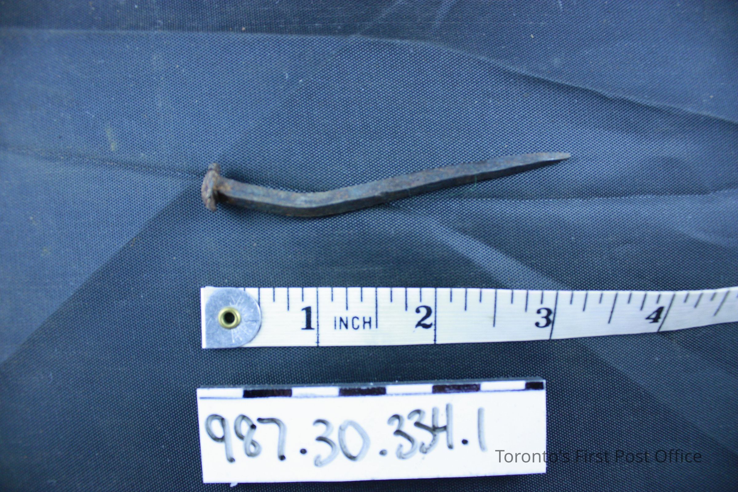 Two nails; roughly forged; irregular heads; bent; removed from above first floor window in south wall, east side.Dimensions