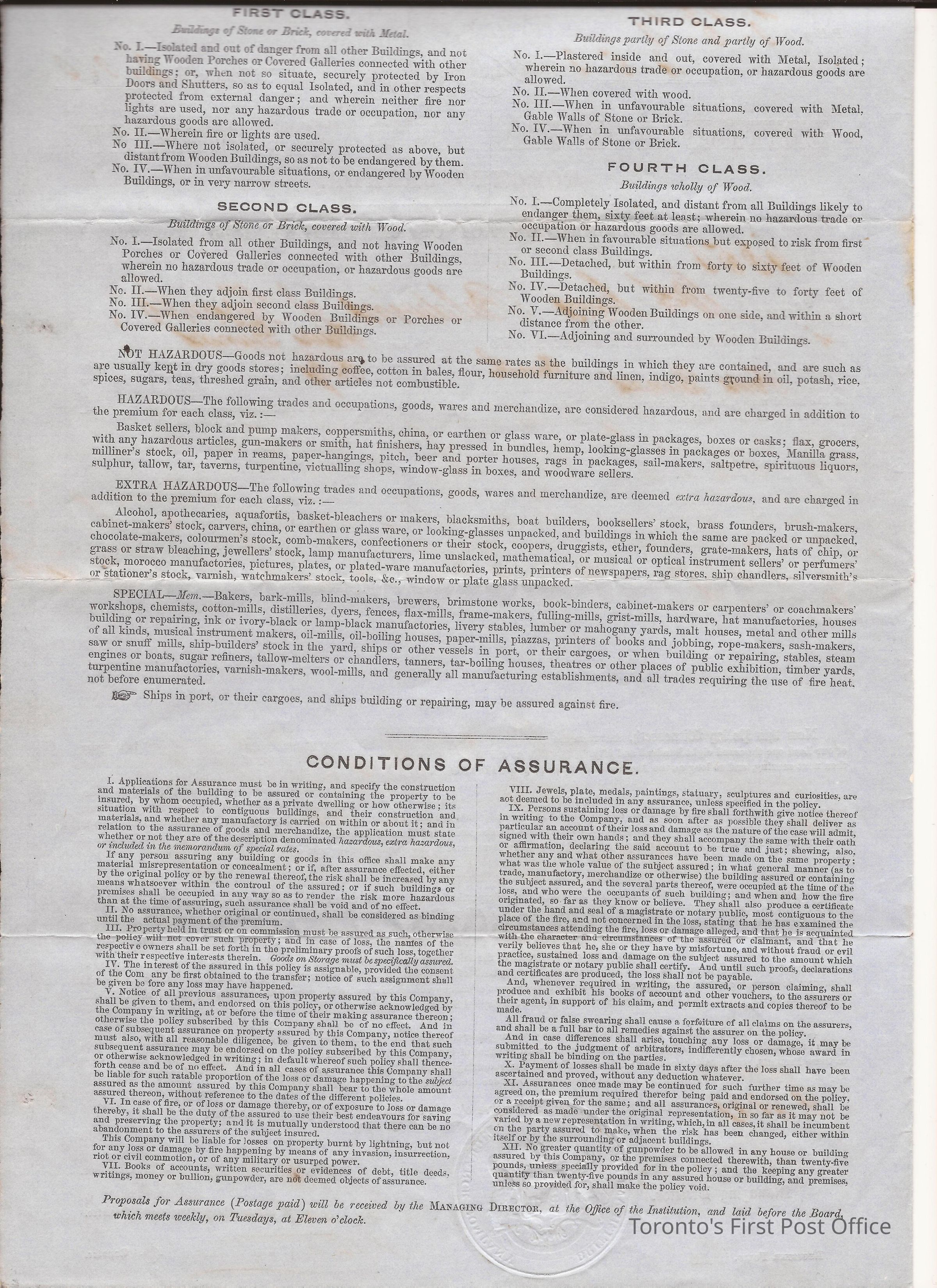 Fire insurance policy for Mrs. Ann Baldwin for $500 under the British America Assurance Company; signed by J.W. Birchall, G.F. Ridout, Th.D. Harris, D. McFarlan, Ann Baldwin; circa 4 July 1854.Update Date