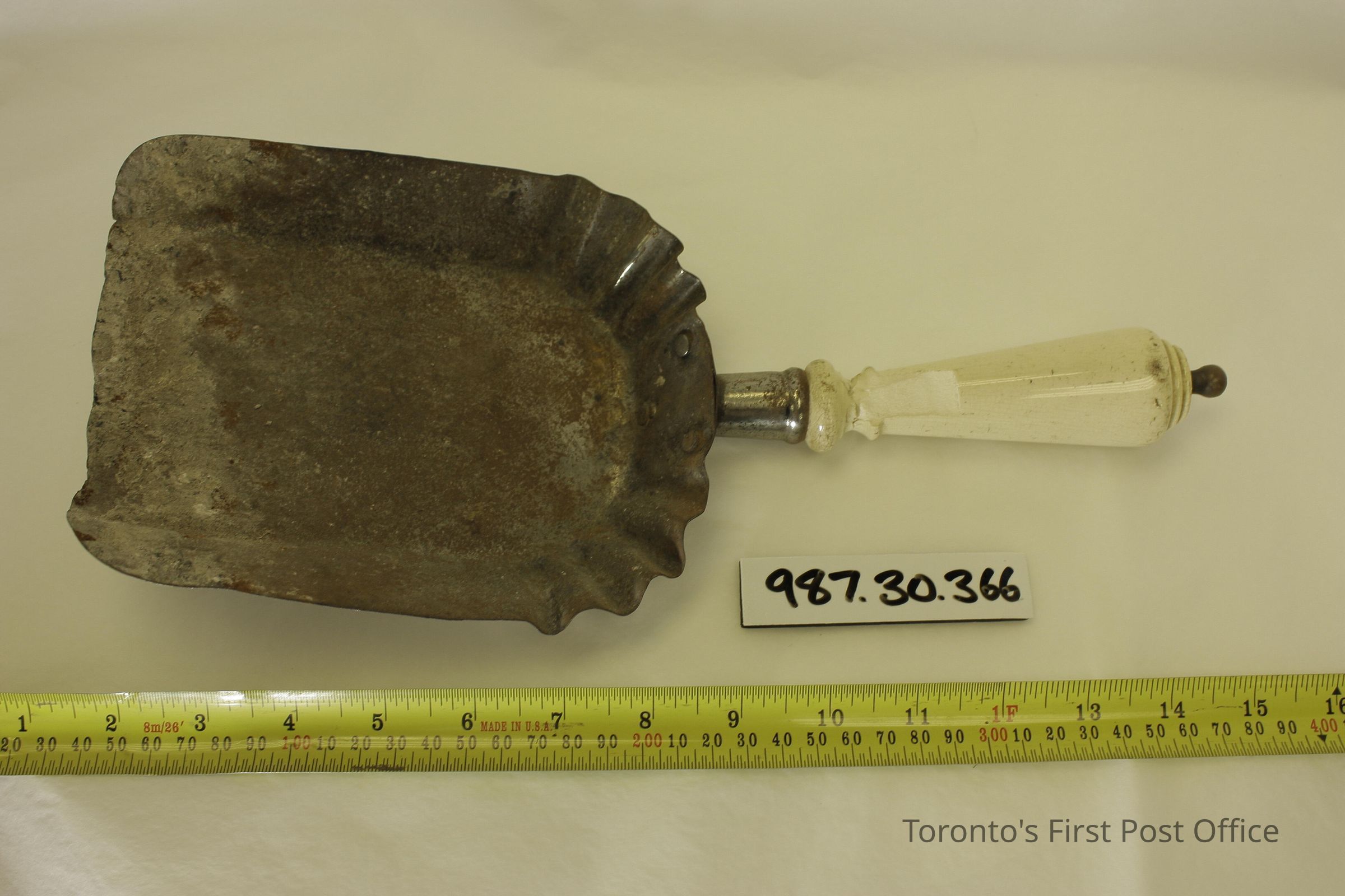 Coal shovel with porcelain handle; round; tapered towards shovel; cream coloured; attached to shovel with three rivets; shovel is rectangular and tapers slightly toward front; fluted along top edge where attached to handle.Dimensions