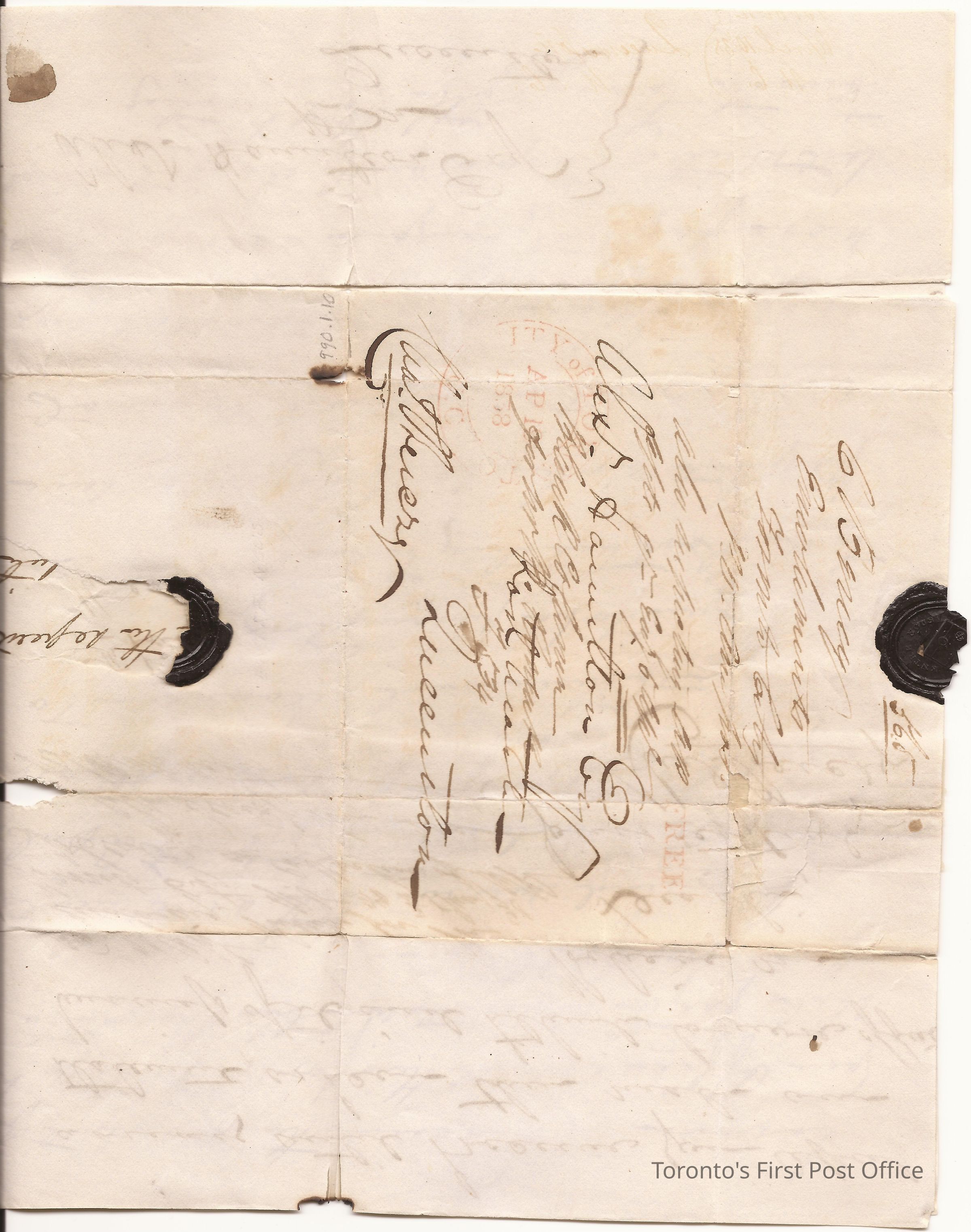 Black wax seal impression of Charles Berczy, marked "ENTRE NOUS" on stampless, folded letter; dated: 19 April 1838.
