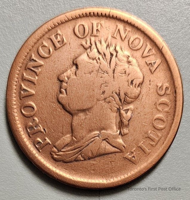 One penny token; Upper Canada currency; Province of Nova Scotia; reverse: head of George IV; 1832.