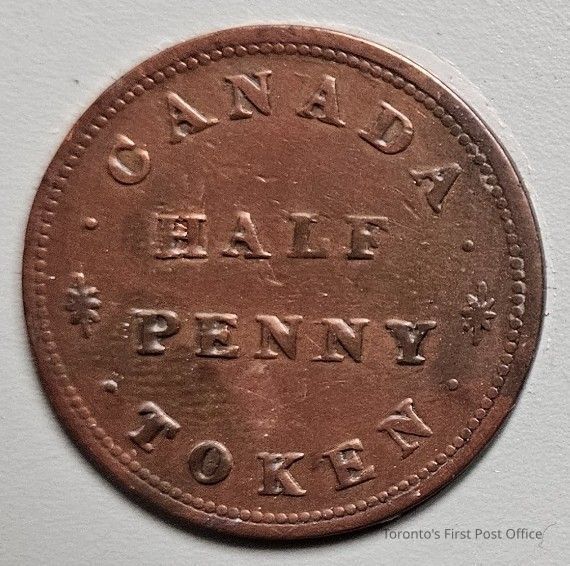 Half penny token; Upper Canada currency; obverse: ship, "For Public Accommodation"; reverse: sloop "Canada".