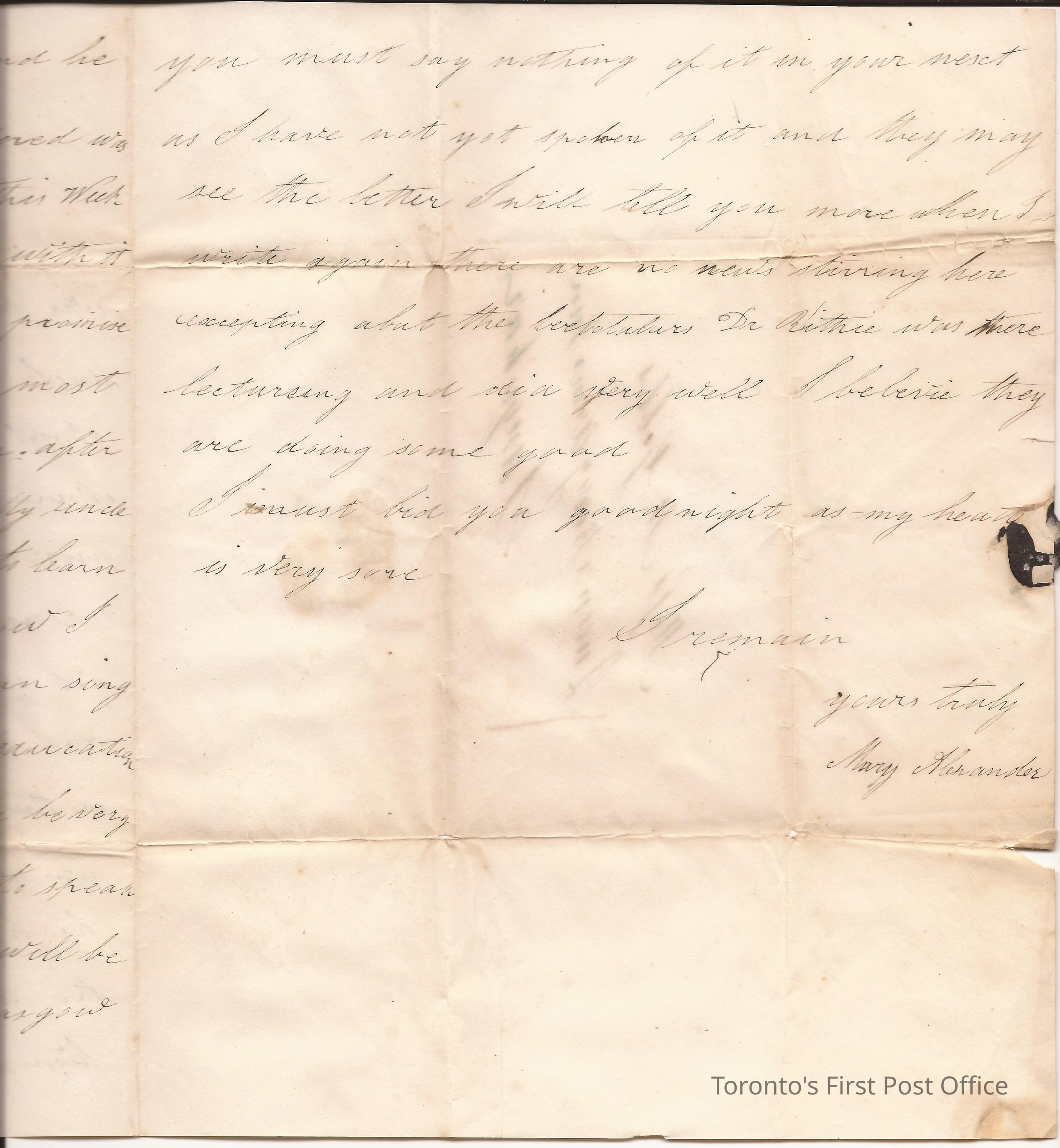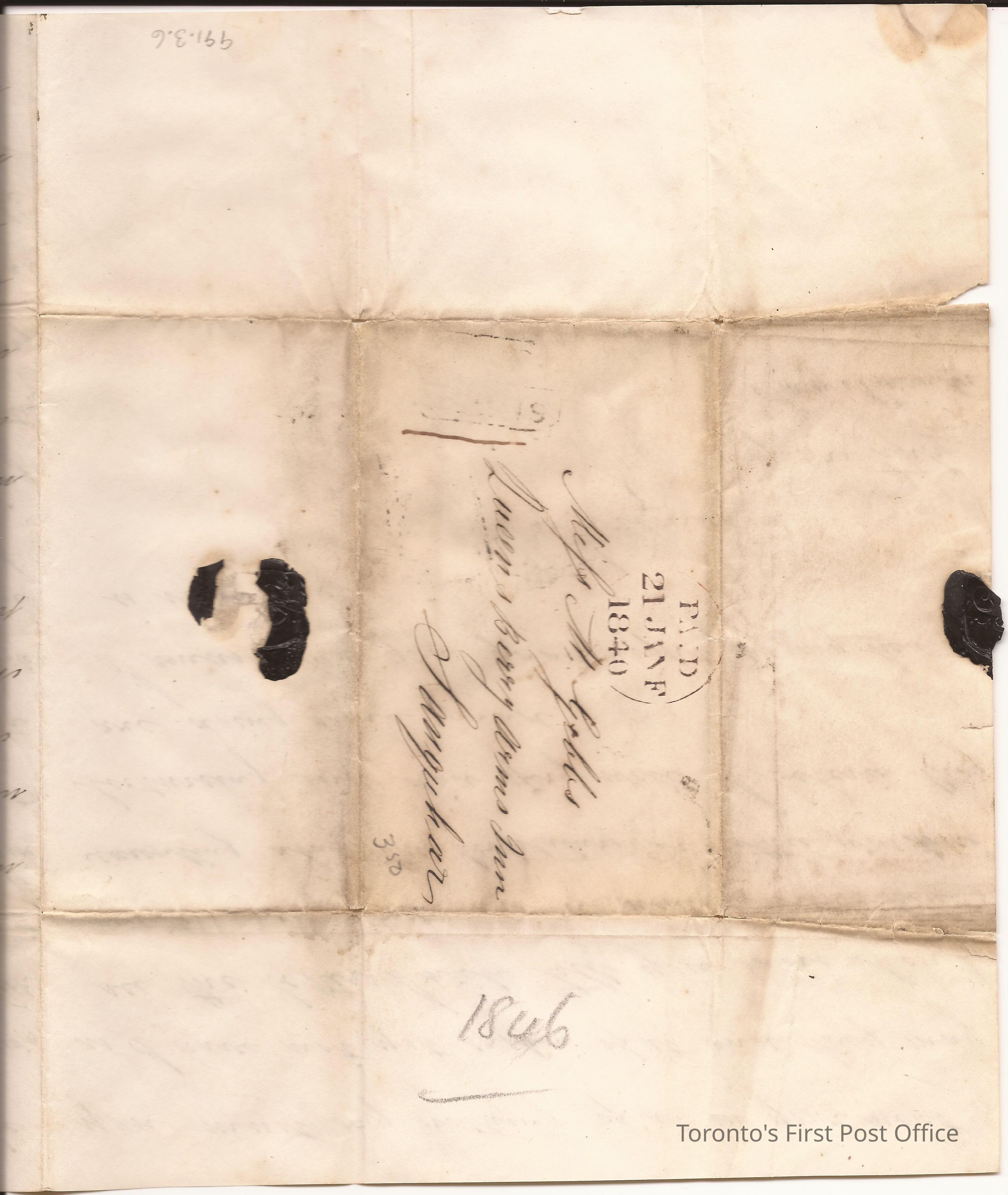 Letter to Miss M. Gibbs, QueensBerry, Arms Inn, Sanguhen; from Mary Alexander; dated: 18 January 1846; white paper, yellowed with age; black ink; black seal; 7 fold lines; black wax seal; re: personal letter.Dimensions