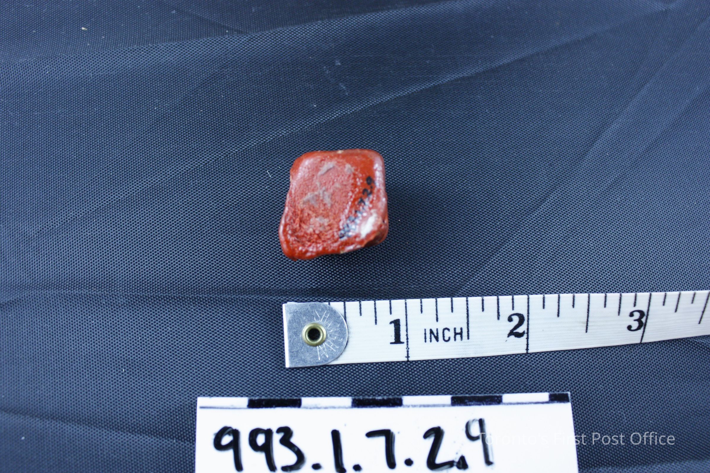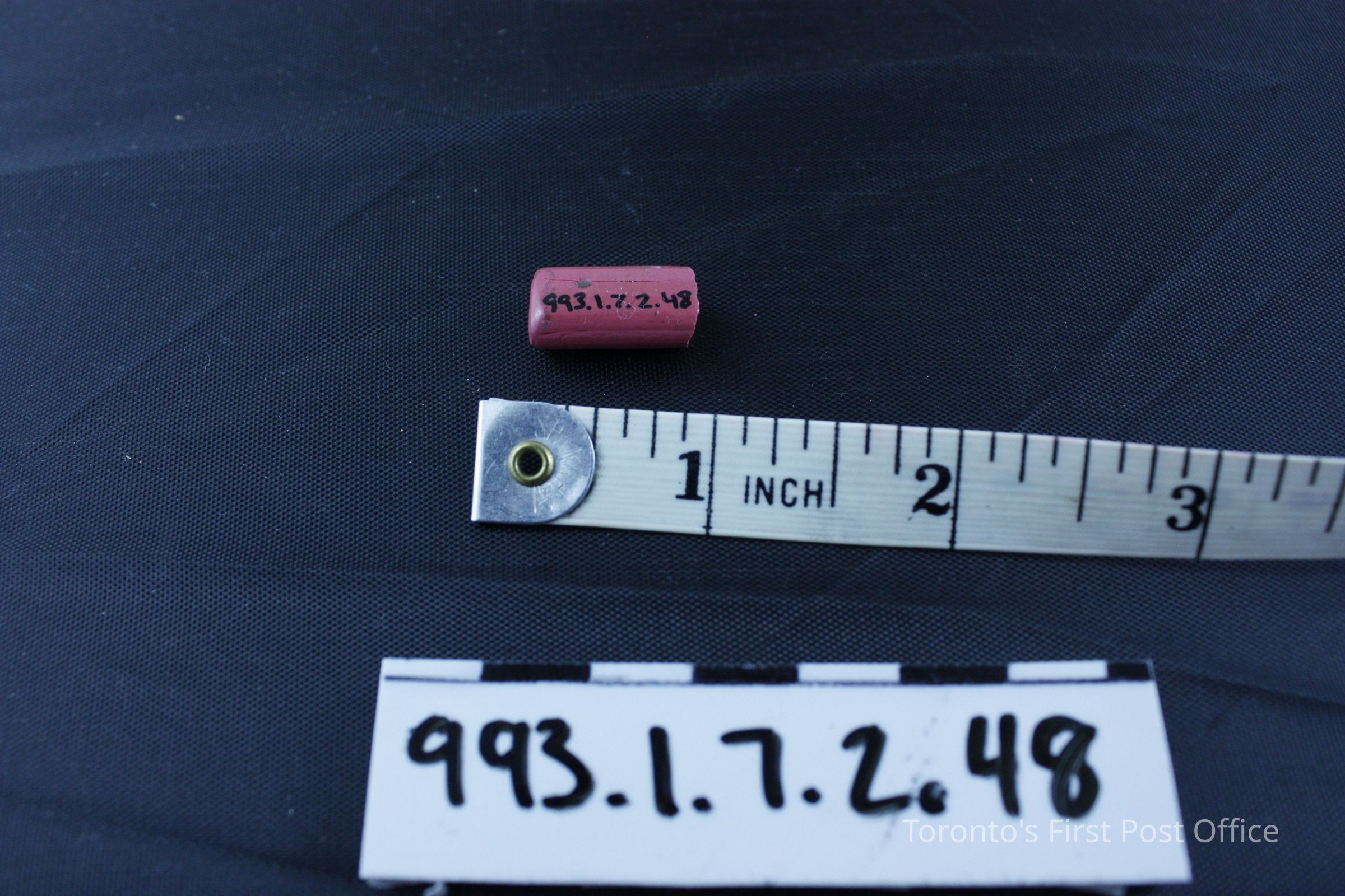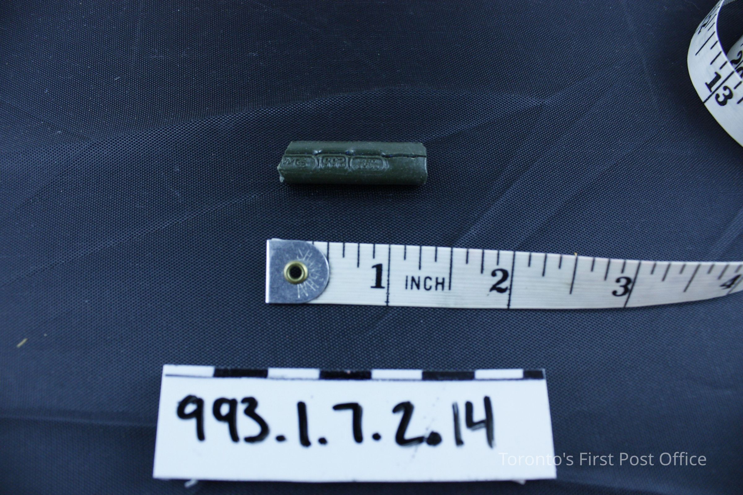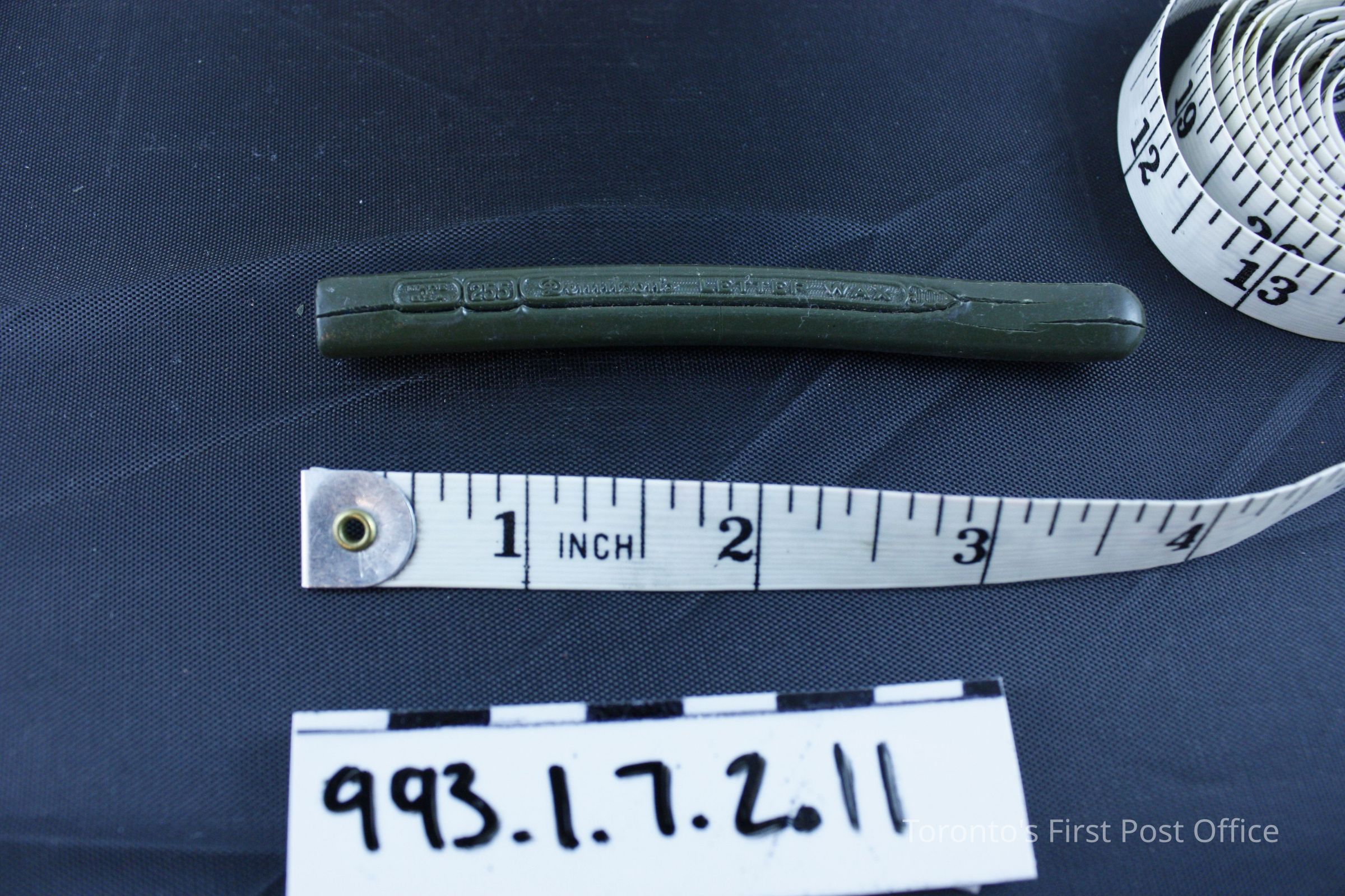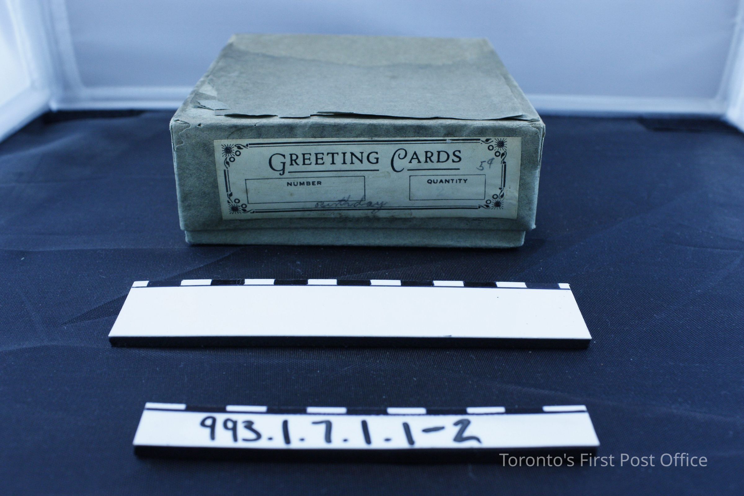 Sealing wax in box, as follows: .1.1-2: cardboard box covered in grey paper; writing on box: "Greeting Cards", "Number", "Quantity", "5 ¢" on white label and "Sealing Wax" written in blue; .2.1-49: various sizes and colours of sealing wax.Dimensions