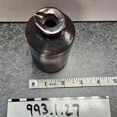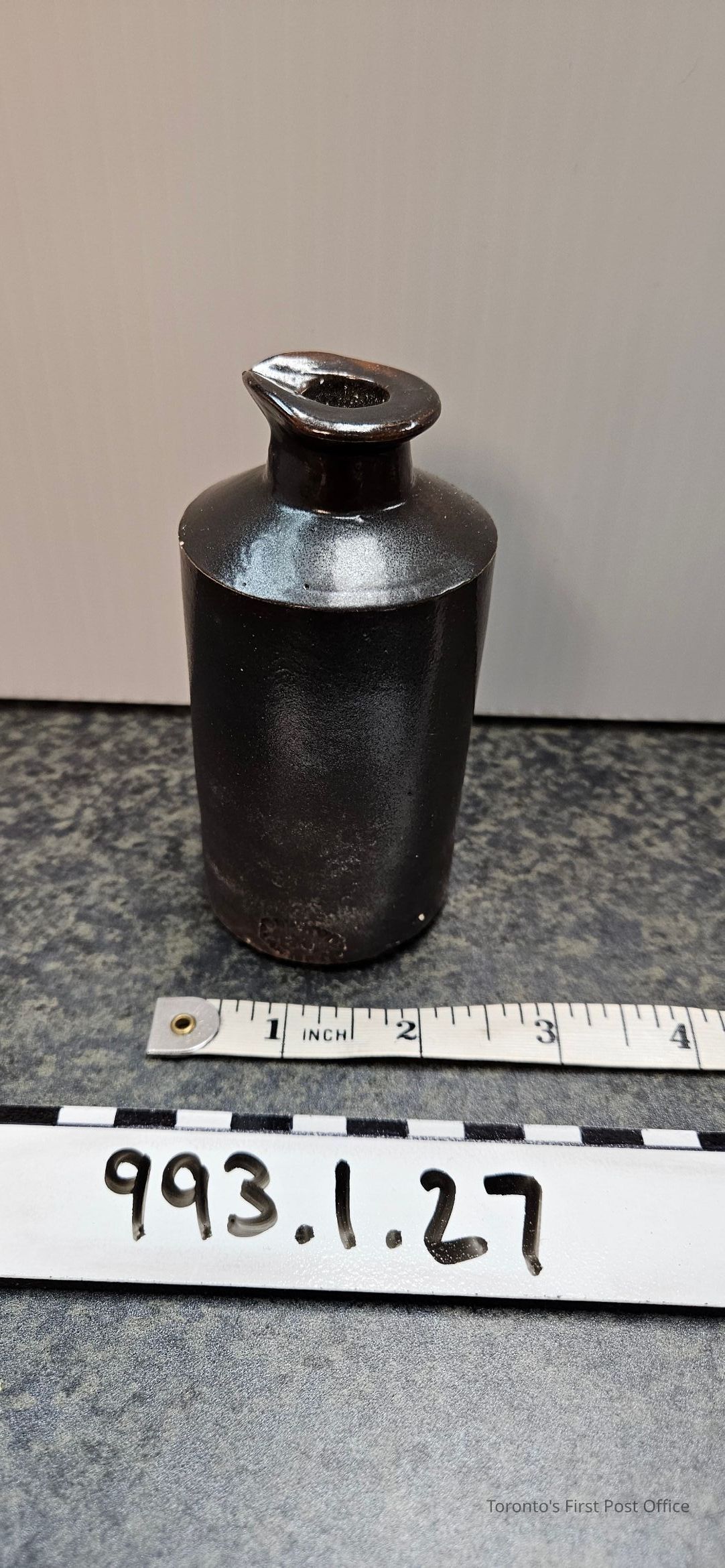 Ink bottle; stoneware; dark brown; pouring lip; cork inside; impressed near base: "Boulton 20 Lambeth"; circa 19th C.Dimensions