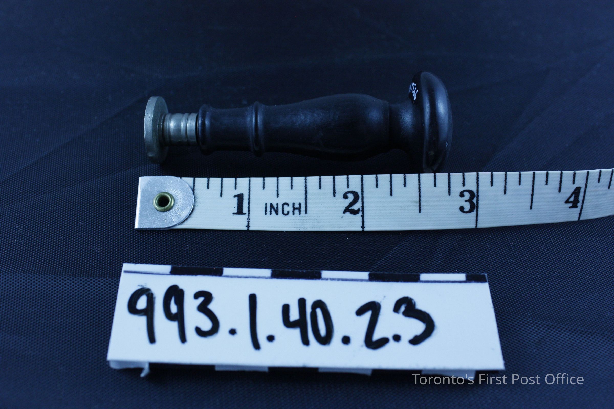 Seal with wood handle; black finish; machine turned; convex top with carved "G"; alloy seal; very light; silver colour; circular with initial "G"; circa 1930s; manufacturer: Dennison.Dimensions