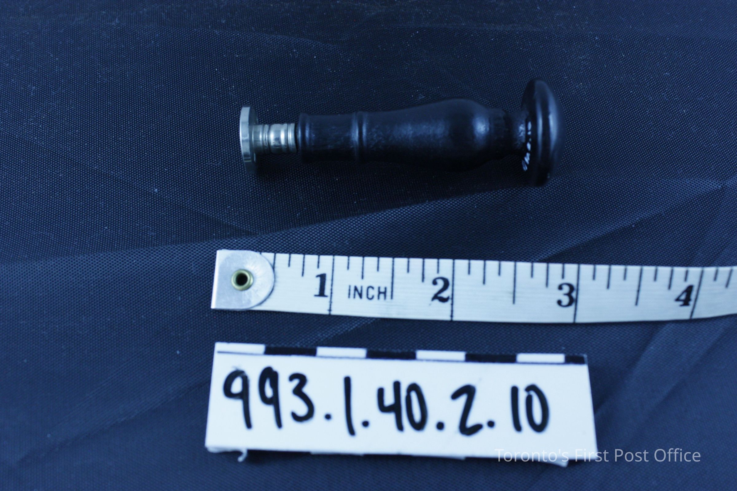 Seal with wood handle; black finish; machine turned; convex top with carved "R"; alloy seal; very light; silver colour; circular with initial "R"; circa 1930s; manufacturer: Dennison.Dimensions