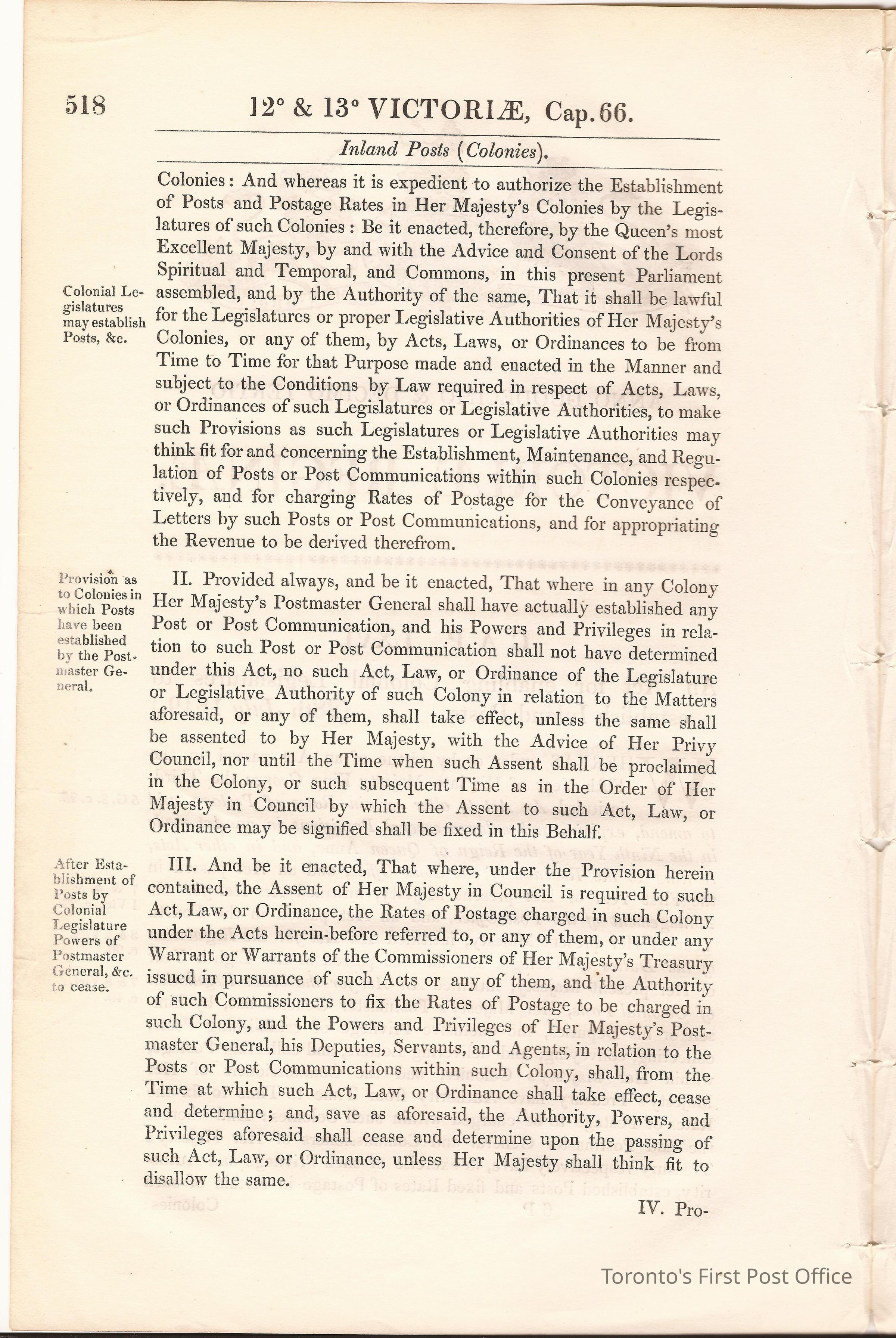 Post Office document: "ANNO DUODECIMO & DECIMO TERTIO VICTORIAE REGINAE CAP LXVI"; an act for enabling Colonial Legislatures to establish Inland Posts; dated July 28, 1849; 3 pp.; thread bound.Dimensions