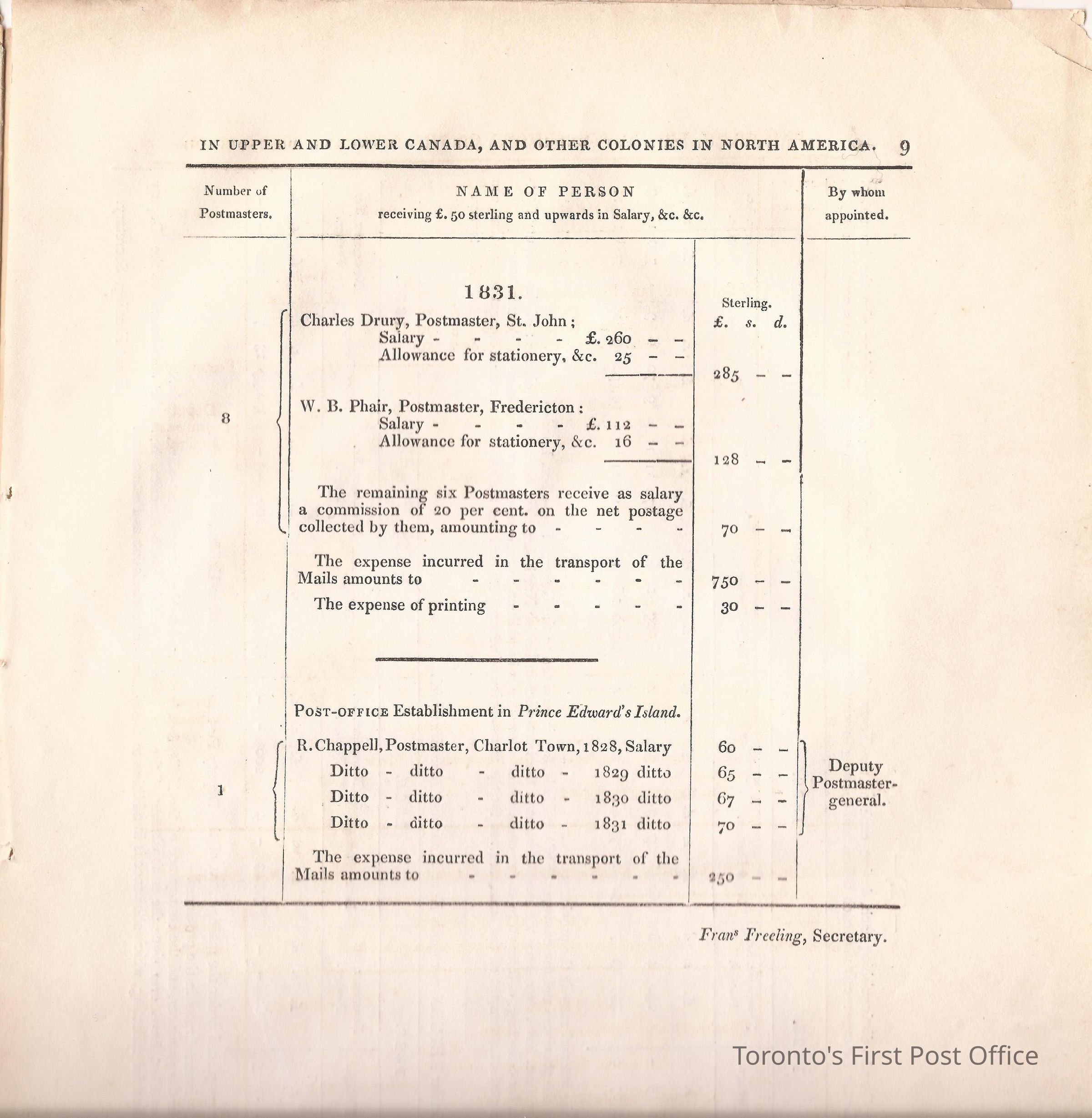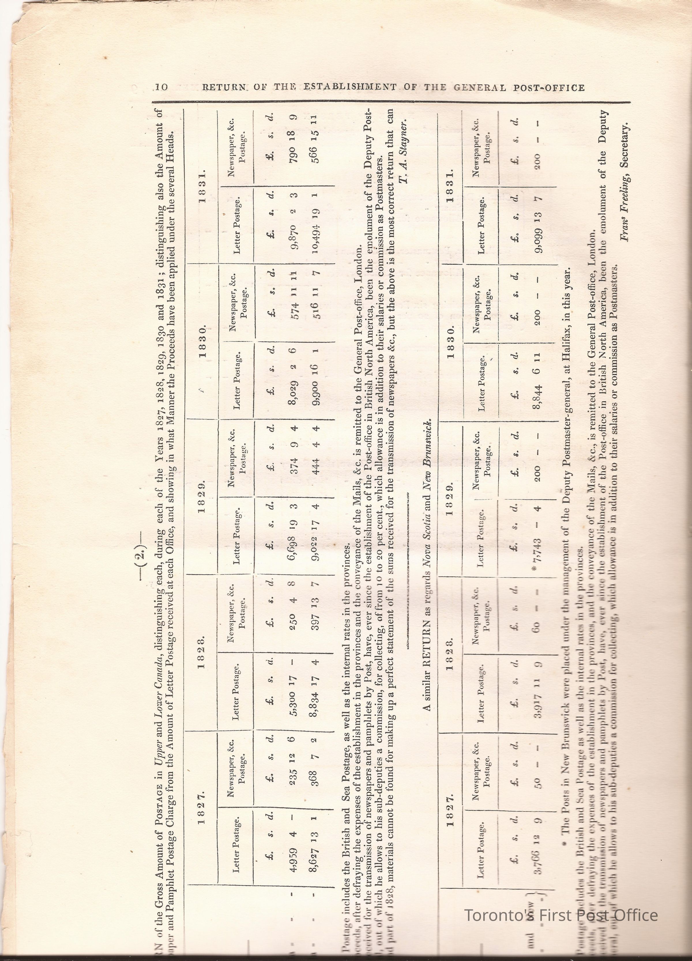 Document titled: "Canada Post Office"; re: number of postmasters and deputy postmasters in each province, their salary, allowance, what other offices these persons held and similar; pages divided into four columns: number of postmasters, name of person, monies received, by whom appointed; last two pages outline postage in U.C./L.C./N.S./N.B. in 1827, 1828, 1829, 1830, and 1831 for letter and newspaper rate; 7 pp, 14 sides of print; cotton thread bound; unbleached paper.Update Date