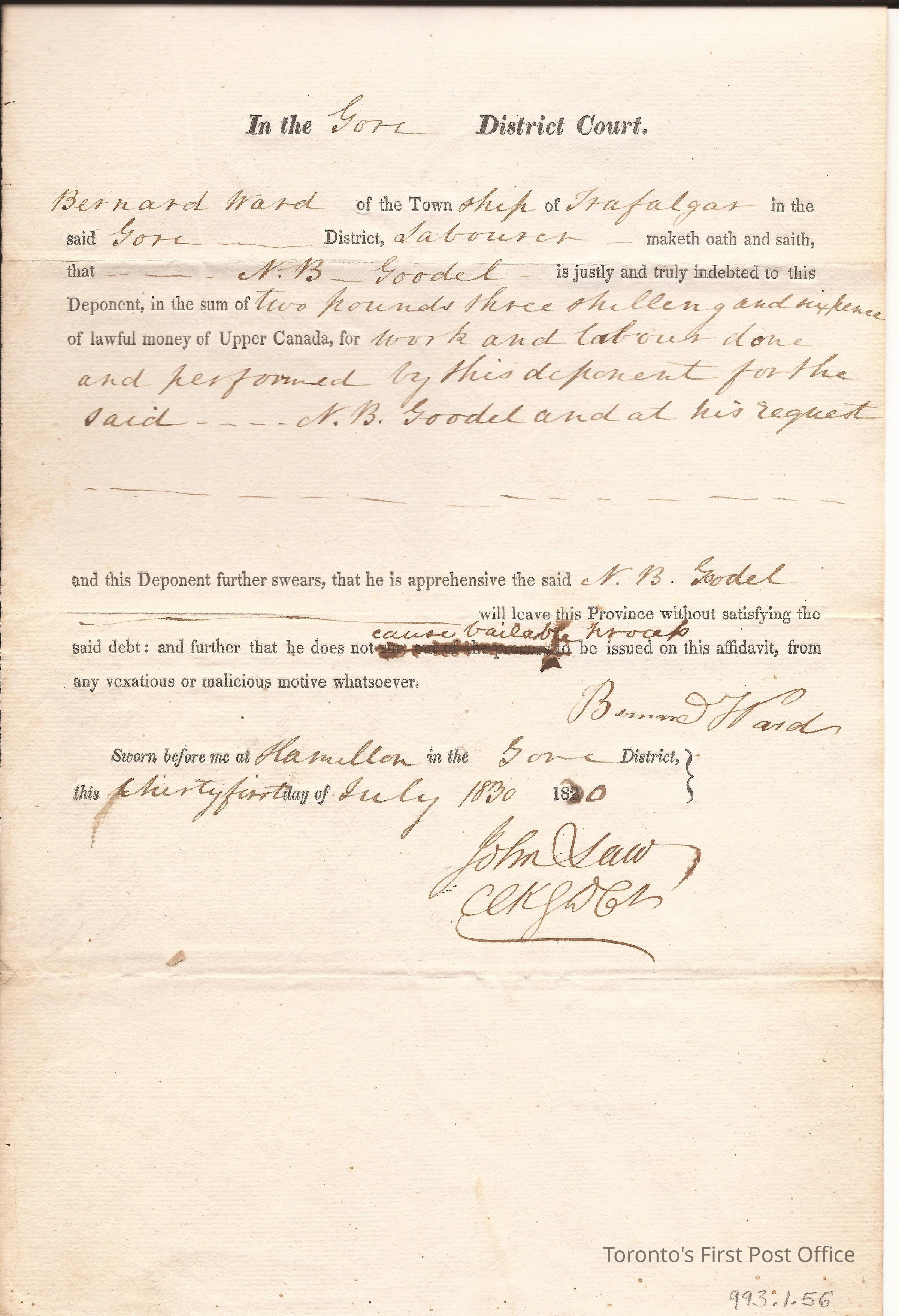 Affidavit to hold bail in case of B. Ward vs. N.B. Goodel; re: Goodel indebted to Bernard Ward for 2 pounds, 3 shillings, and 6 pence; signed Bernard Ward; signed John Saw clk GD ct (Clerk Gore District Court); filed July 31st 1830; signed Allan N. MacNabb Pltfs Atty.Update Date