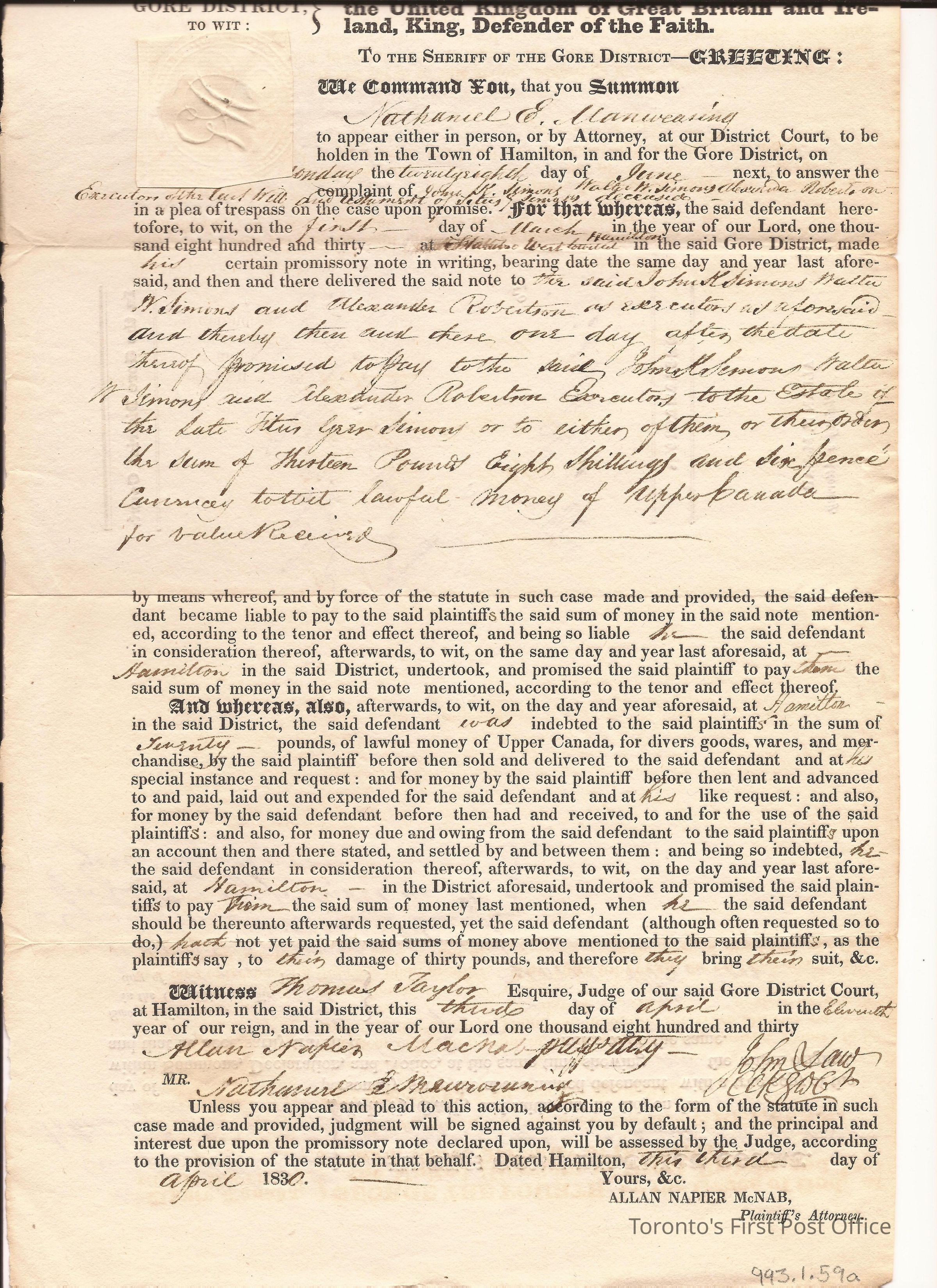 .1: Writ; manuscript and print; Gore District; re: commanding Sheriff in the matter of John W. Simons, W.W. Simons and Alexander Robertson Executors of J.G. Simons Deceased vs. Nathaniel E. Manswearing; printed form of Allan N. MacNab, Plaintiff's Attorney; signed by John Saw, Clerk of Gore District Court; dated 3 April 1830; 2 pp.