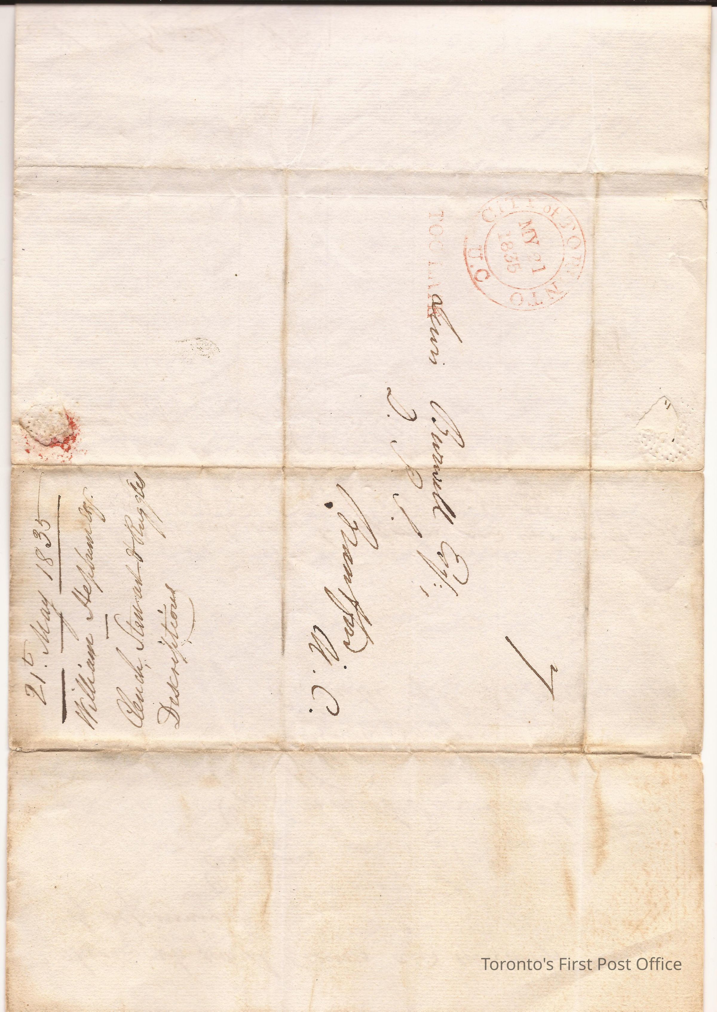 Letter and cover; from William Hepburn, "Acting Trustee of the Six Nations Indians"; to Lewis Burwell Deputy Provincial Surveyor at Brantford; dated: 21 May 1835; marks: red "CITY OF TORONTO", "MY 21 1835"; rated "7"; 4 pp.; watermark: "W & F Fincher 1826"; red wafer seal; re: description of land leased by Mrs. Elizabeth Cleuch from the late Captain Joseph Brant.Update Date