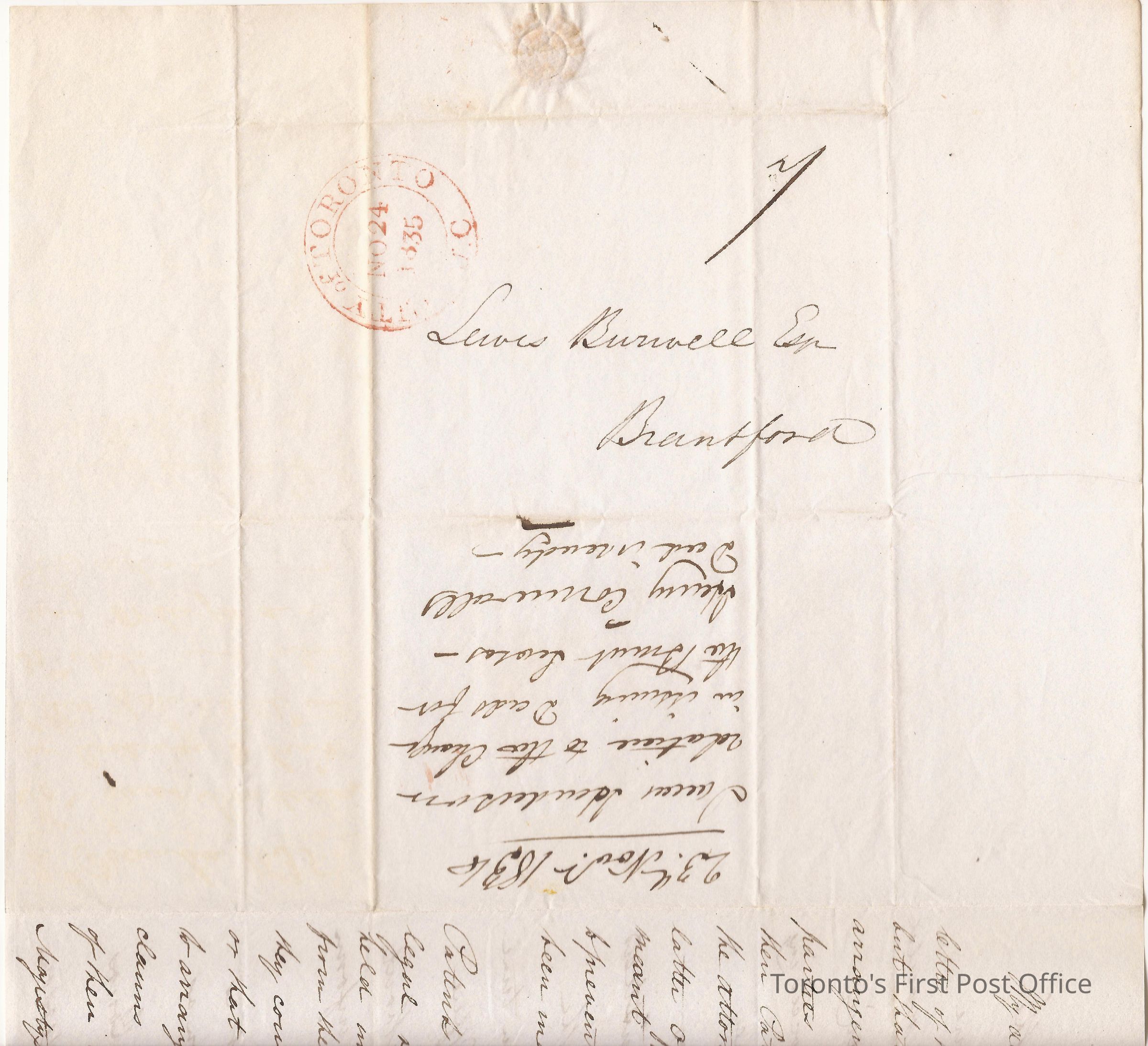 Letter and cover; from James Henderson, Commissioner of Crown Lands Office; to Lewis Burwell, Deputy Surveyor at Brantford; dated: 23 Nov 1835; marks: red "CITY OF TORONTO", "NO 24 1835"; rated "7"; 3 pp.; yellow wafer seal; watermark: "ROBERT WEIR-CARRON MILL 1833"; re: proper procedures of releasing documents for land leases or purchases.Dimensions