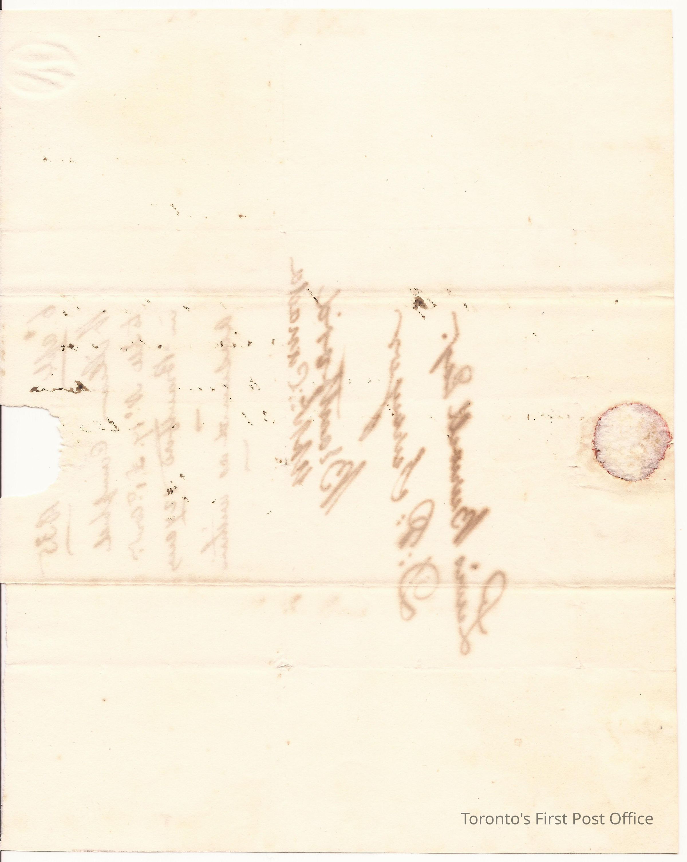 Letter and cover; from William Campbell; to Lewis Burwell, Deputy Surveyor at Brantford; dated: 6 April 1835; marks: red "CITY OF TORONTO", "AP 8 1835", "PAID"; red wafer seal; small message on cover.Dimensions