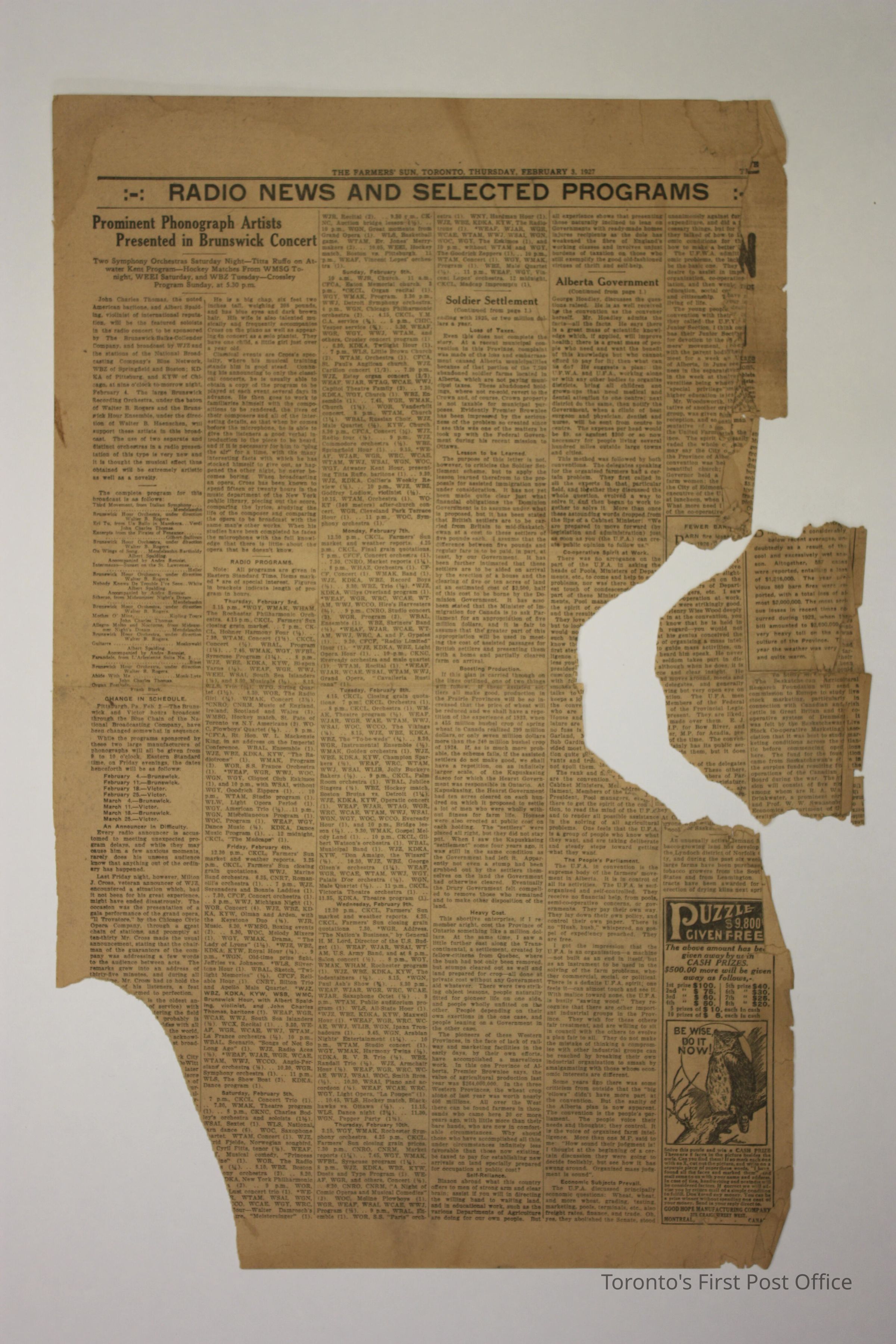 Newspaper: "The Farmer's Sun"; Toronto, Thursday, Feb 3/27; 4 pp. (incomplete); newsprint with black ink; published by the United Farmer's Co-Operative of Ontario from Head Office at the Bank of Upper Canada Building at Duke and George; re: farm news, UFO Club activities.Dimensions