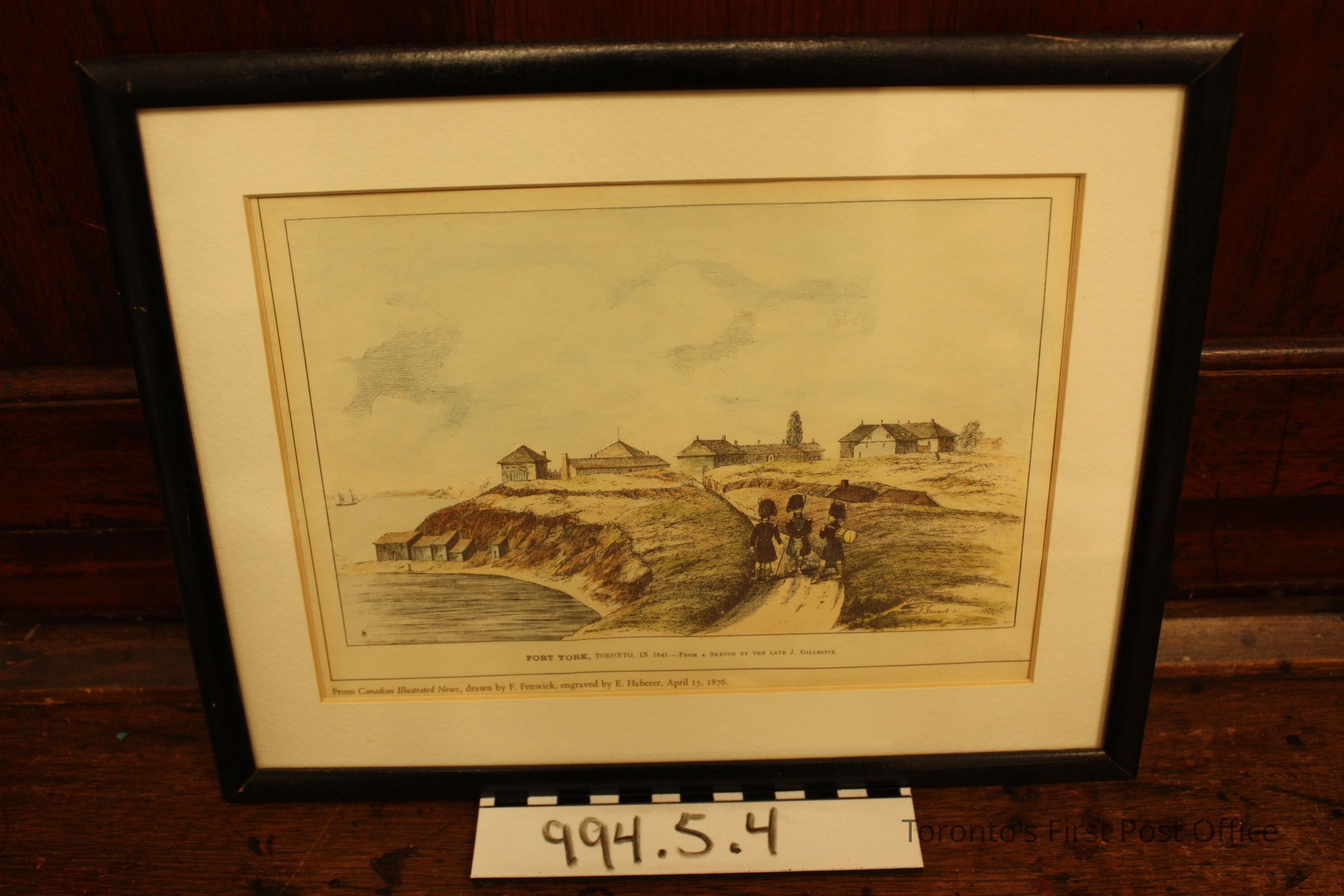 Print: "Fort York, Toronto, in 1841"; hand-tinted in green, yellow, and orange on beige background; shows waterfront and Fort at distance, three soldiers in kilts walking in foreground, one holds a drum.Dimensions