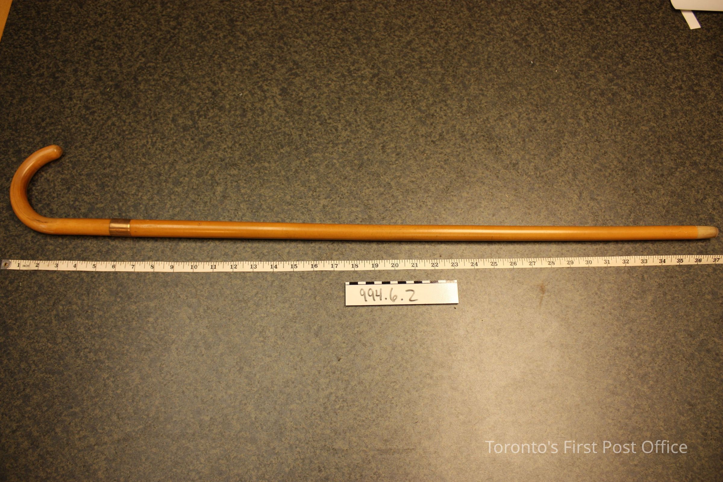 Walking stick with curved handle; gold band beneath handle inscribed "Sidney Small 70 Walmer Road Toronto"; bone tip tapered at end.Update Date