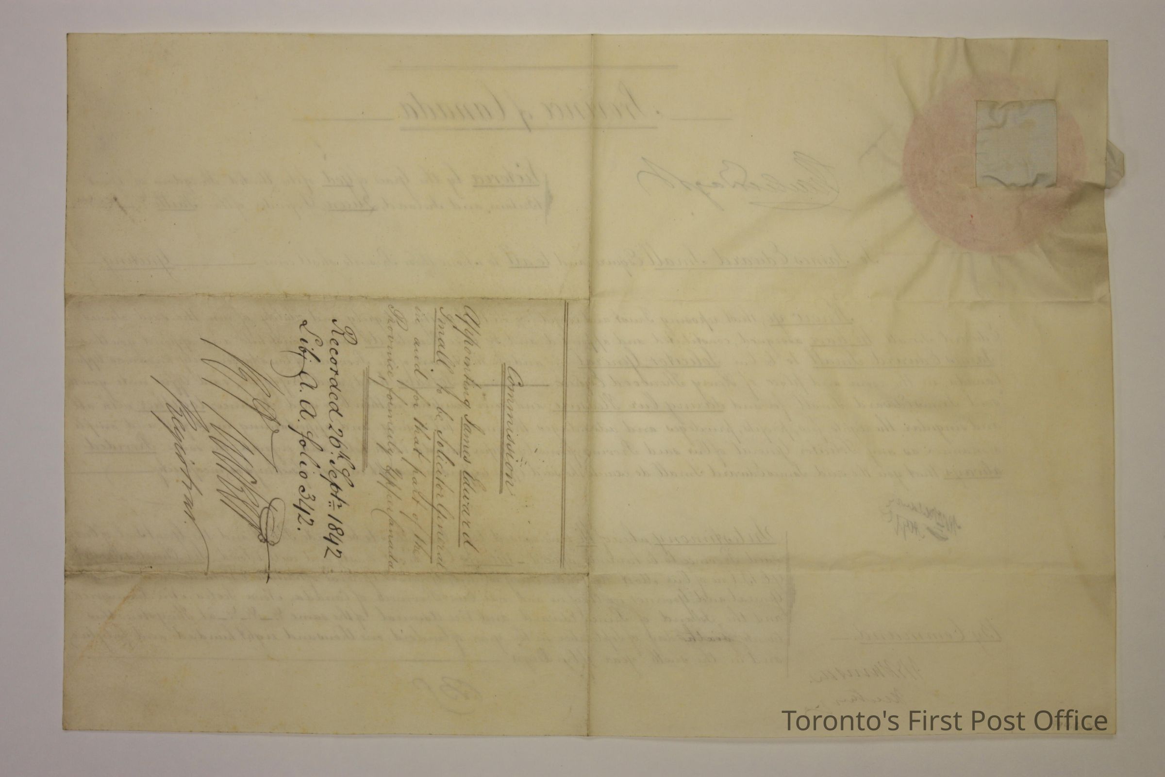 Commission appointing James Edward Small to be Solicitor General in and for that part of the Province, formerly Upper Canada; recorded 26th Sept. 1842; folio 342; signed R. Tucker, Registrar; manuscript; wafer seal is of Province of Canada; parchment; signed also by Sir Charles Bagot, Governor General, and Robert Baldwin.Dimensions