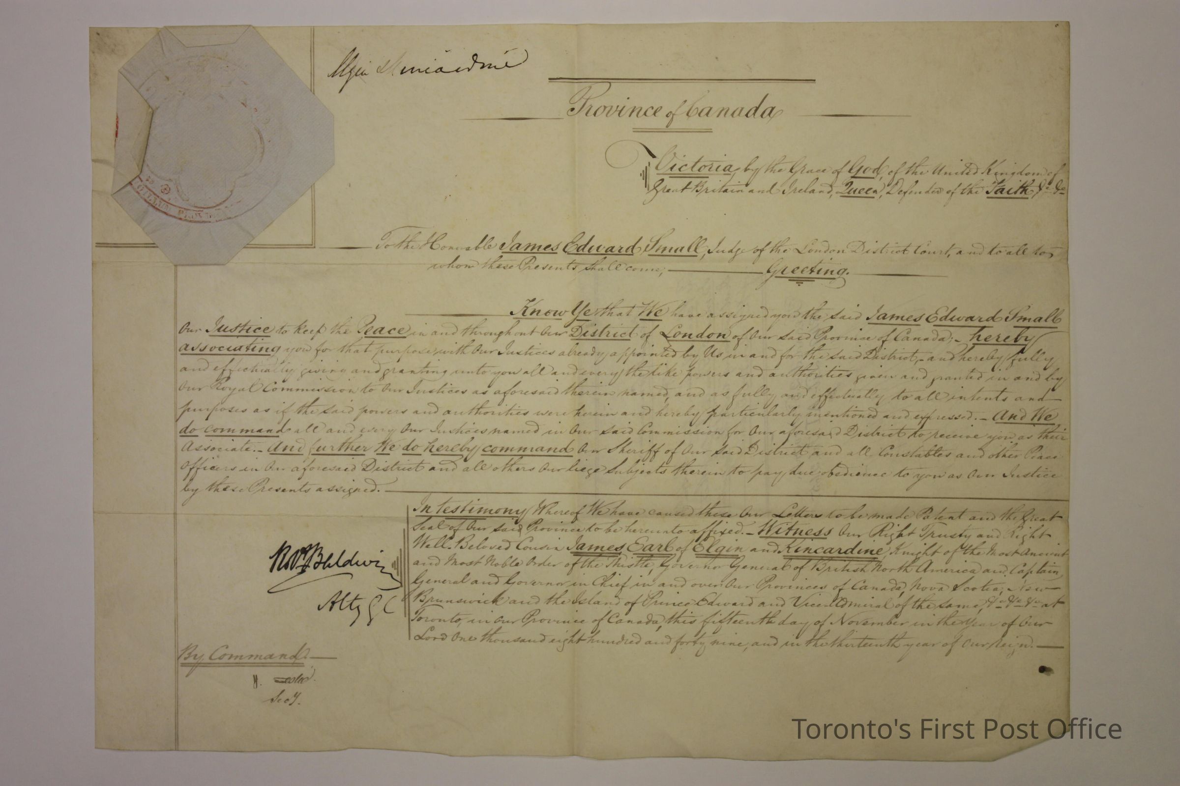 Commission appointing James Edward Small, Esq. as a member of the Executive Council; recorded 26 Sept 1842; signed R.A. Tucker, Registrar; witnessed by Robt Baldwin Atty Gl.; manuscript; parchment; red wafer seal "Province of Upper Canada".Dimensions