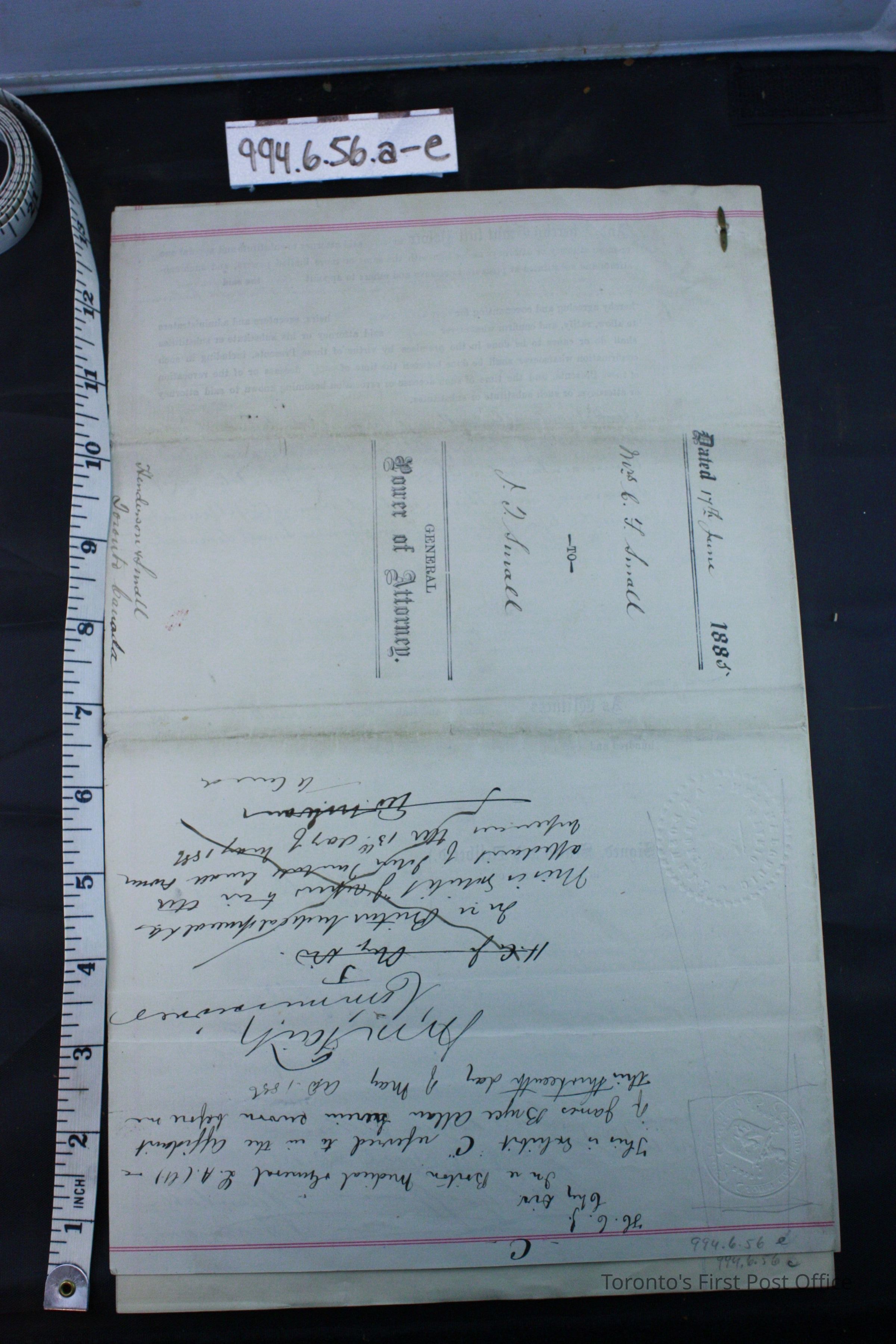 "C" document; foolscap sized paper; re: Power of Attorney C.F. Small appointing J.T. Small as attorney to execute John Thomas Small last will and testament, deceased husband of C.F. Small; filed 17th June 1885.Dimensions