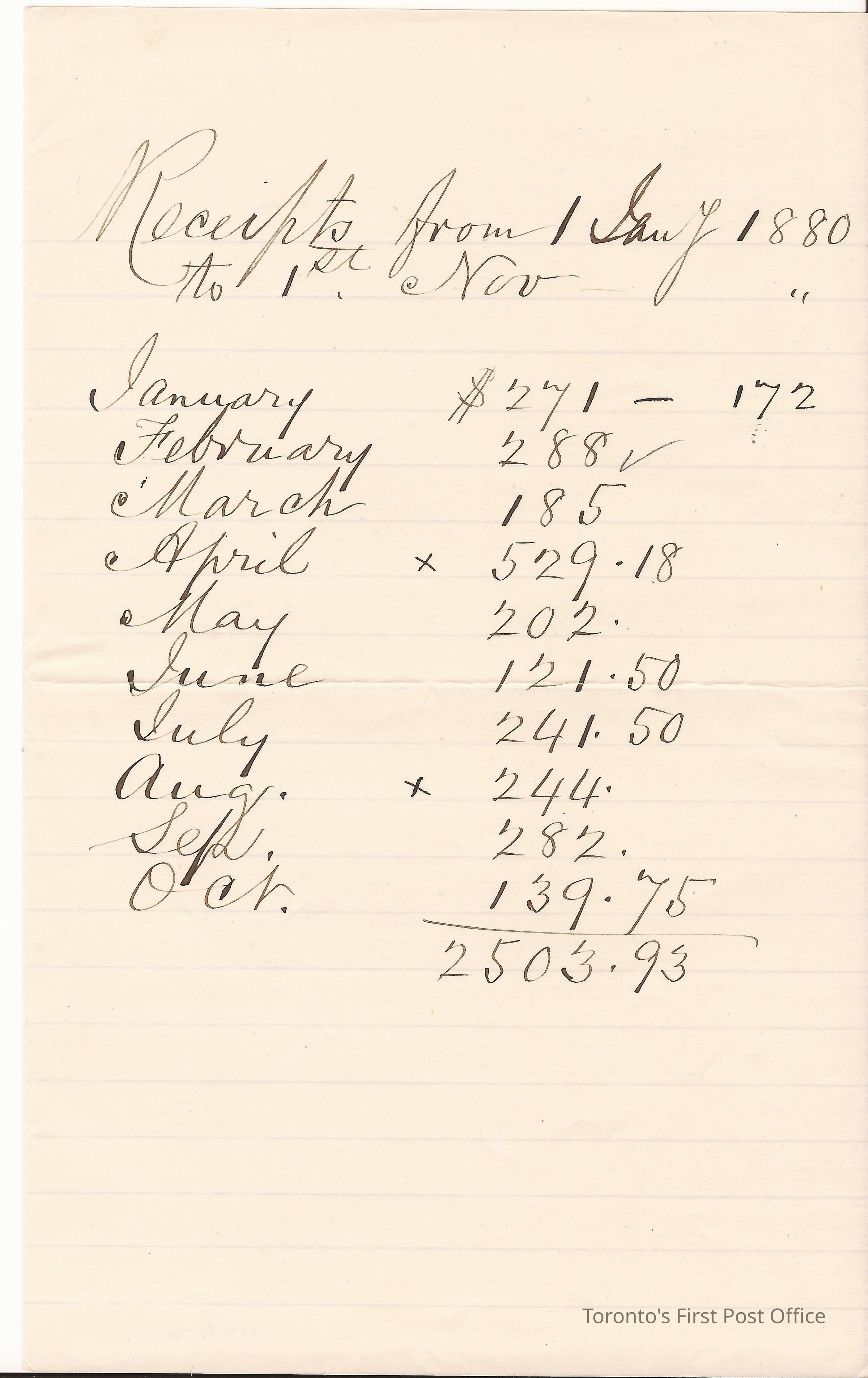 Receipt; dated from 1 Jany 1880- 1 Nov 1880; totaling $2503.93; laid paper with blue guide lines.Dimensions