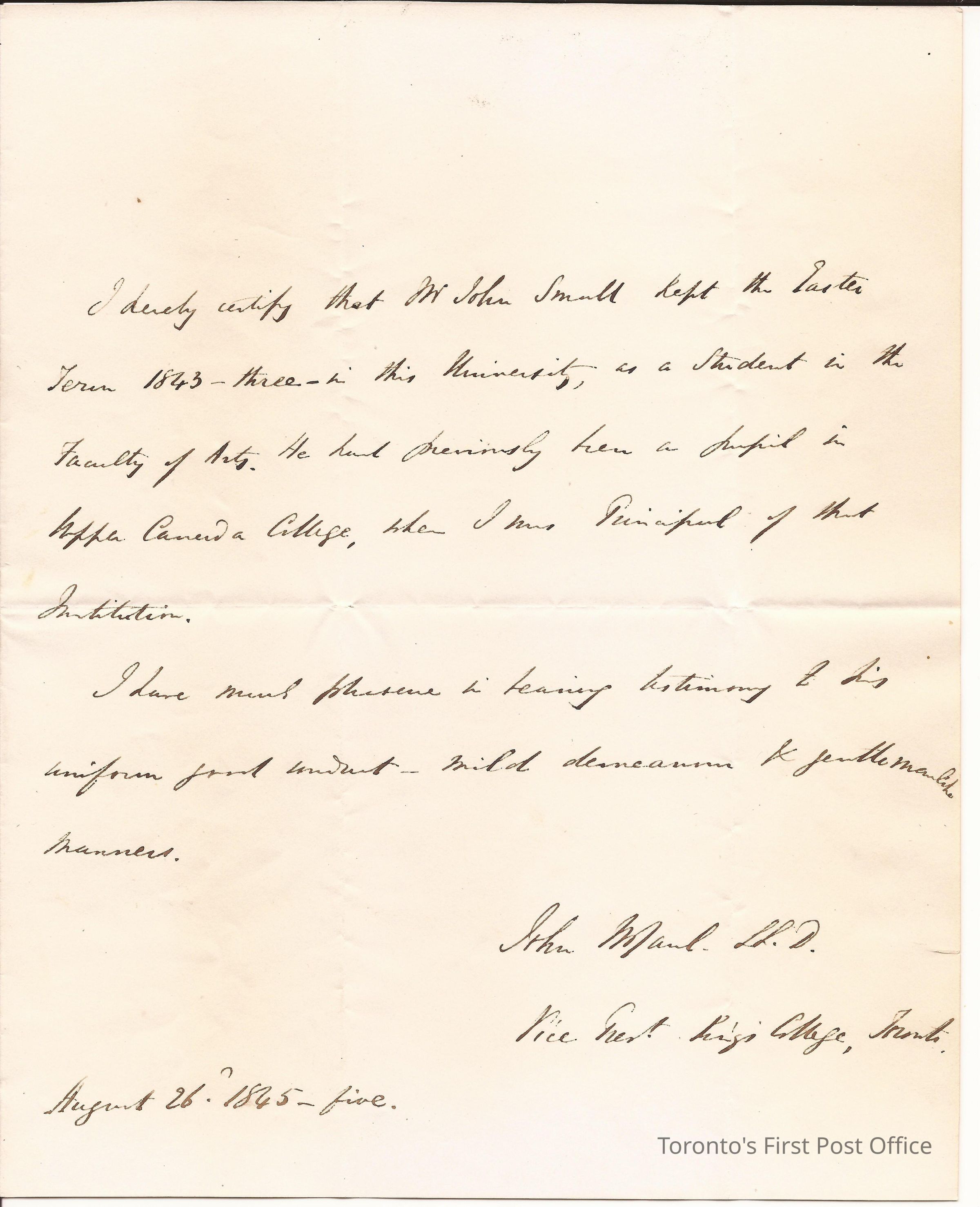 Document re: attesting to attendance during Easter Term 1843 at University of Toronto in the faculty of Arts Dept.; from John McCaul, Vice President King's College, Toronto; watermark: "C ANSELL 1841".Dimensions