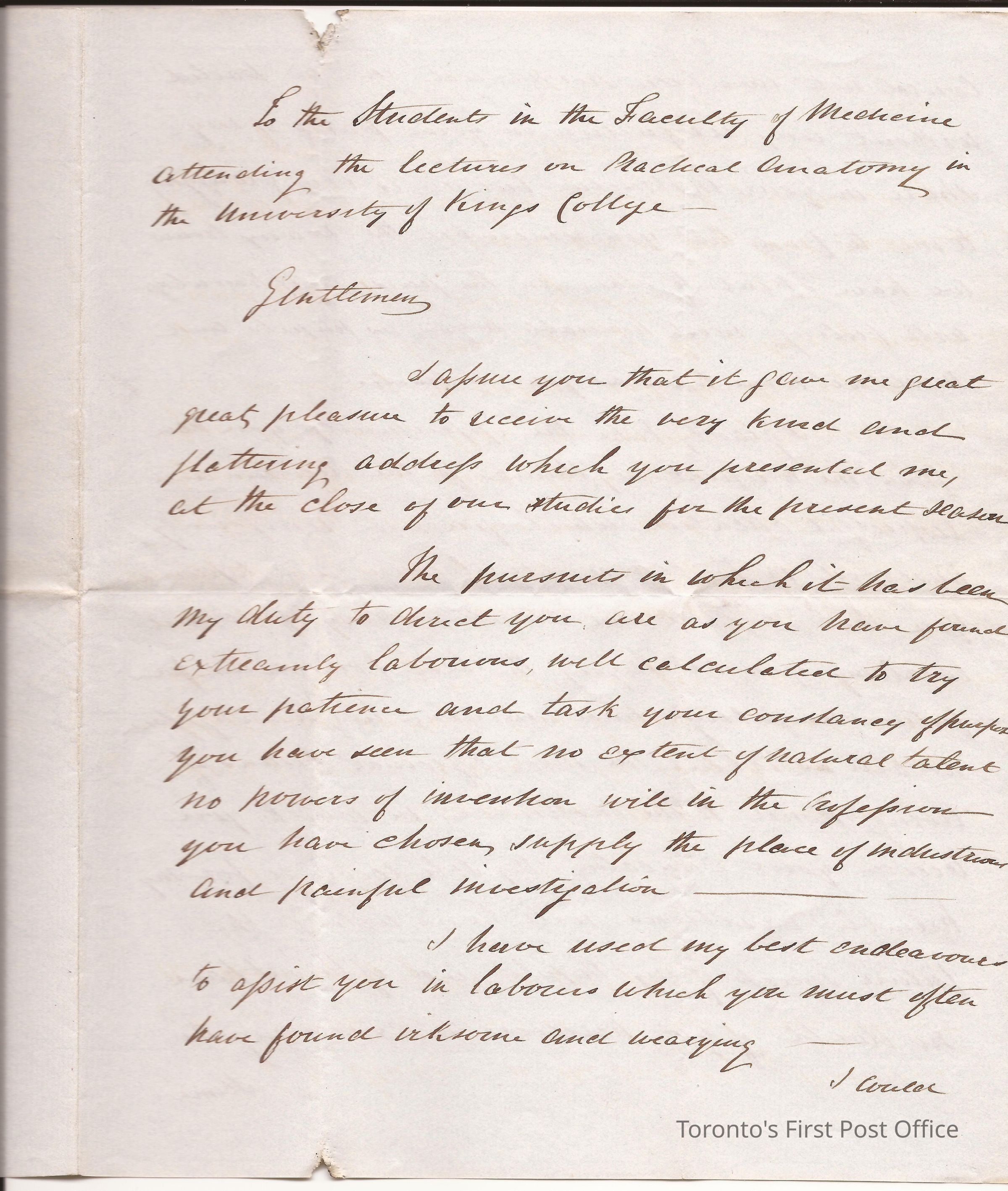 Open letter to Faculty of Medicine students in Anatomy at King's College thanking them for the kind and flattering address presented J.H.S.; dated University of Toronto, King's College, Mar 22 1845; black ink.Update Date