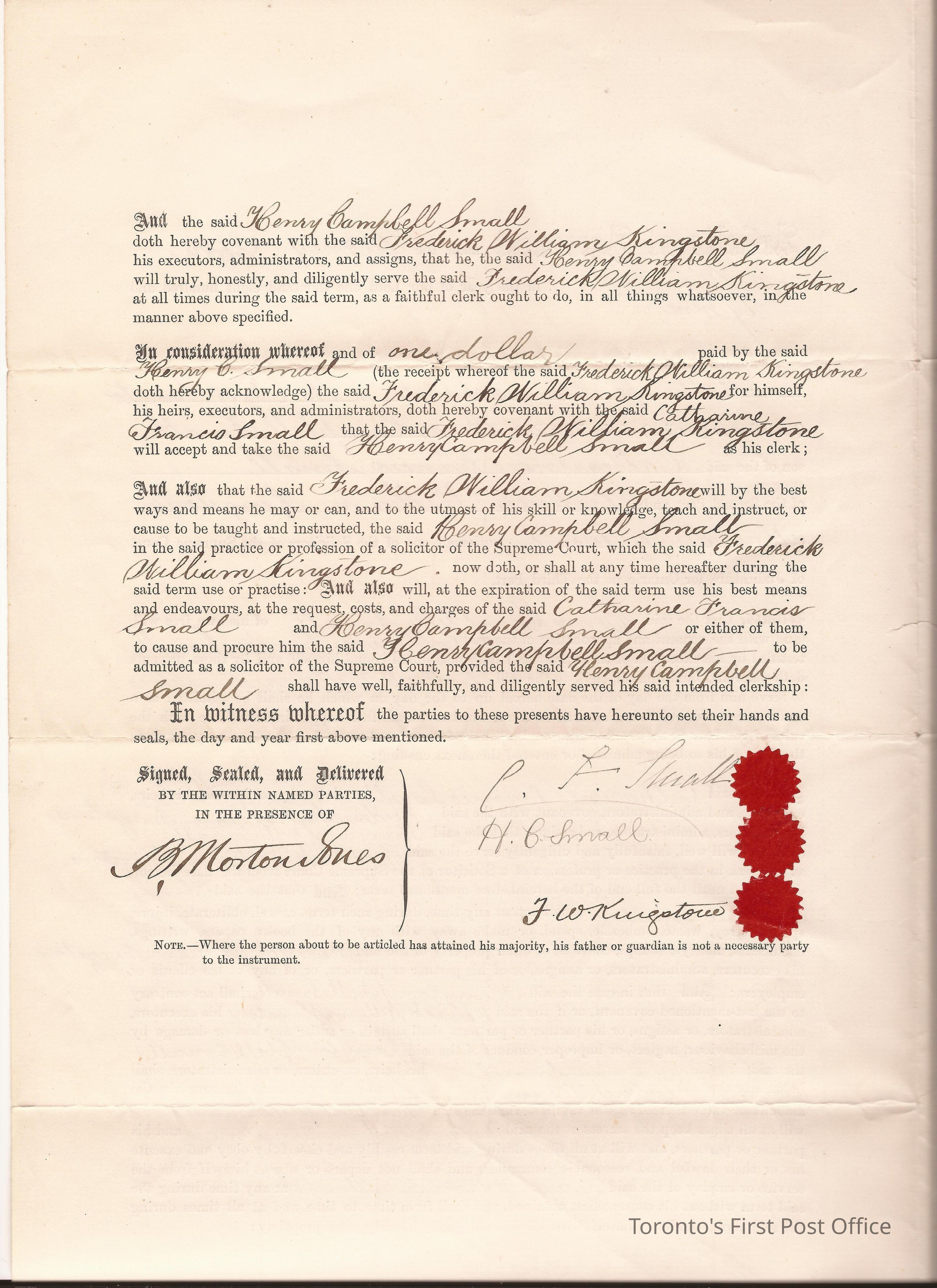 Document; article of agreement between Catherine Francis Small, Henry Campbell Small, and Frederick William Kingston for HCS to bind himself to Kingston for five years to learn law; signed by B. Morton Jones; dated Oct 26, 1889.; laid paper.Update Date