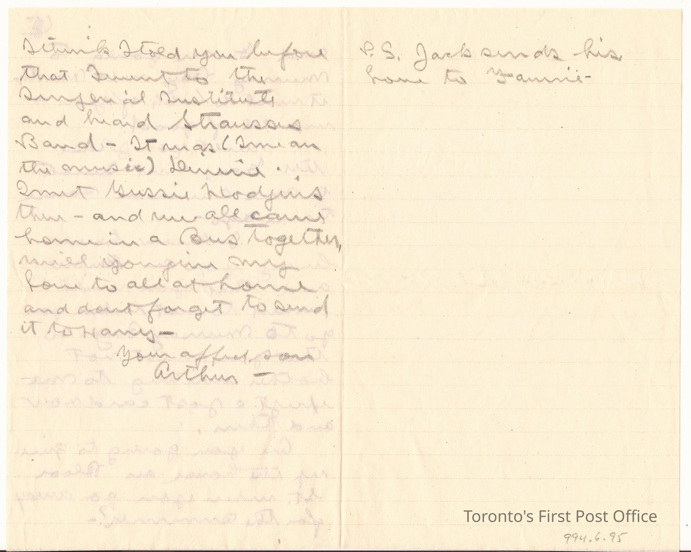 Letter; to Maty(?); from Arthur; watermark: "SILVERBURN LINEN"; pencil; re: personal, Jubilee procession, horses, Queen, N.W. Mounted Police, etc.; dated: 5 Upper Woburn Place London WC June 26 97.Update Date