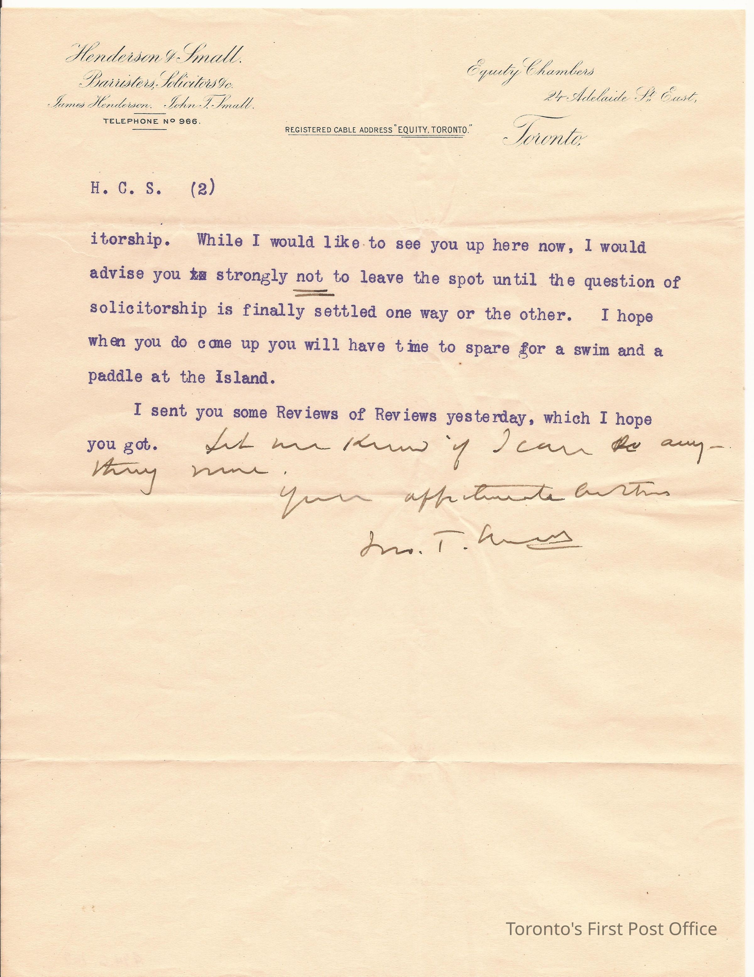 Letter; from Deputy Chambers, 24 Adelaide St. E.; to Harry; dated July 19 /98; on "Henderson & Small Barristers, Solicitors etc." letterhead; re: advice on how and when to apply as new solicitor for branch of Union Bank of Canada in Carlton Place; watermark: "BURMESE LINEN PARCHMENT"; black manuscript, purple print; 2 pp.Update Date