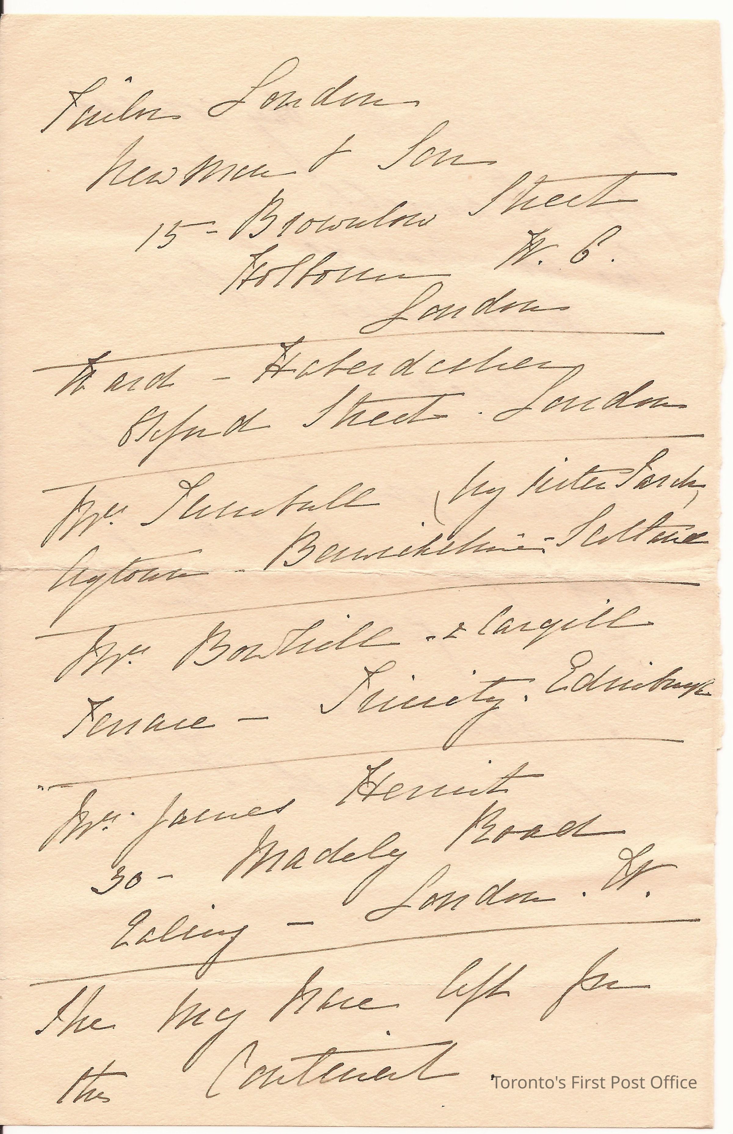 Letter; re: list of addresses, ex: Newman & Sons Tailors, London, Mens Haberdashery, London, Mrs. Turnbull, my sister Sarah, Aytown, Berwickshire, Scotland; black ink on half a page only.Dimensions