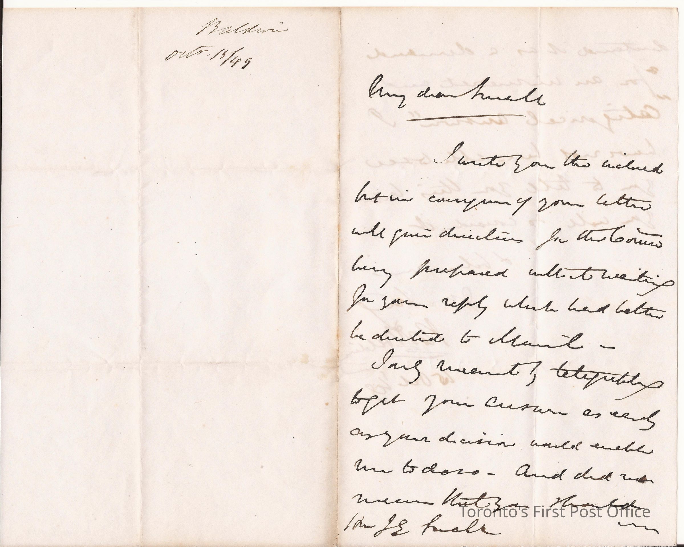 Letter; to J.E. Small; from Robt Baldwin; dated Oct 15/49; re: business; black ink on heavy paper.Dimensions