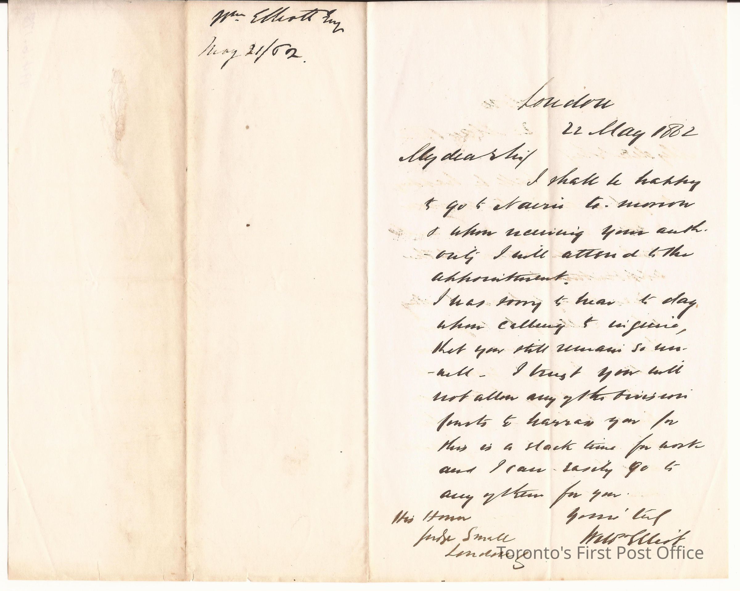 Letter; to Honor Judge Small, London; from Wm. Elliot; dated London 22 May 1882; re: Elliot will look after some of the business for J.E. Small, very concerned; black ink on thin laid paper.Update Date