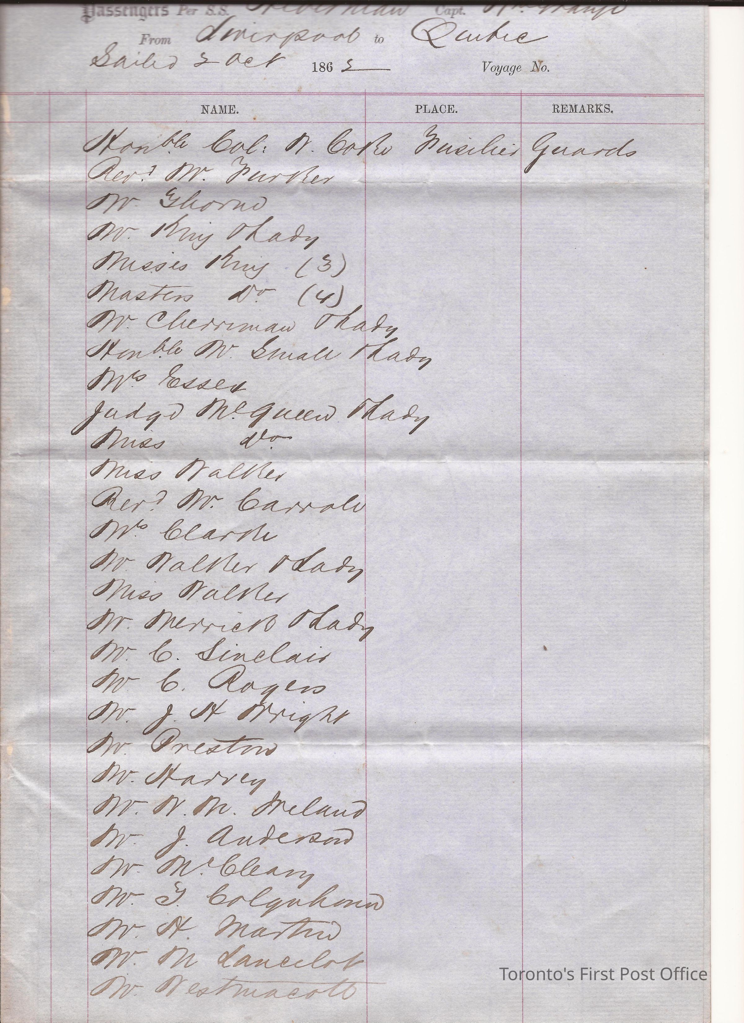 Document: "Purser's List: Passengers for S.S. Hibernian Captain Mr. Grange from Liverpool to Quebec, sailed 2 Oct 1862"; columns under headings of "Name", "Place", "Remarks"; lists total of 55 cabin and 248 steerage passengers and a list of officers; letterhead: "Montreal Ocean Steam Ship Company"; watermark: "Britannia"; 3 pp.Dimensions