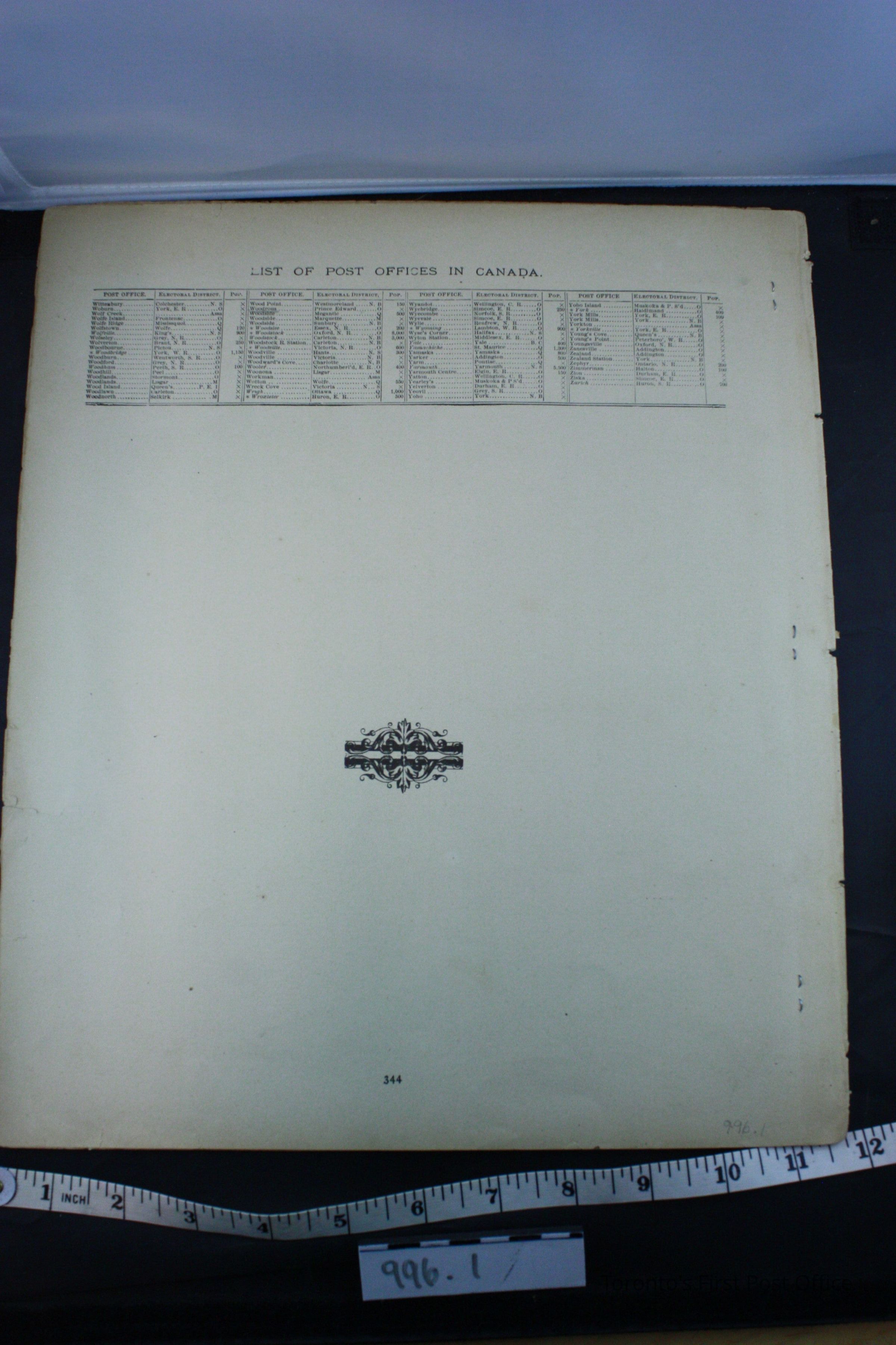 Book: "List of Post Offices in Canada, 1887"; column headings: "Post Office", "Electoral District", "Pop."; pages 331-344; list of post offices in alphabetical order.Dimensions