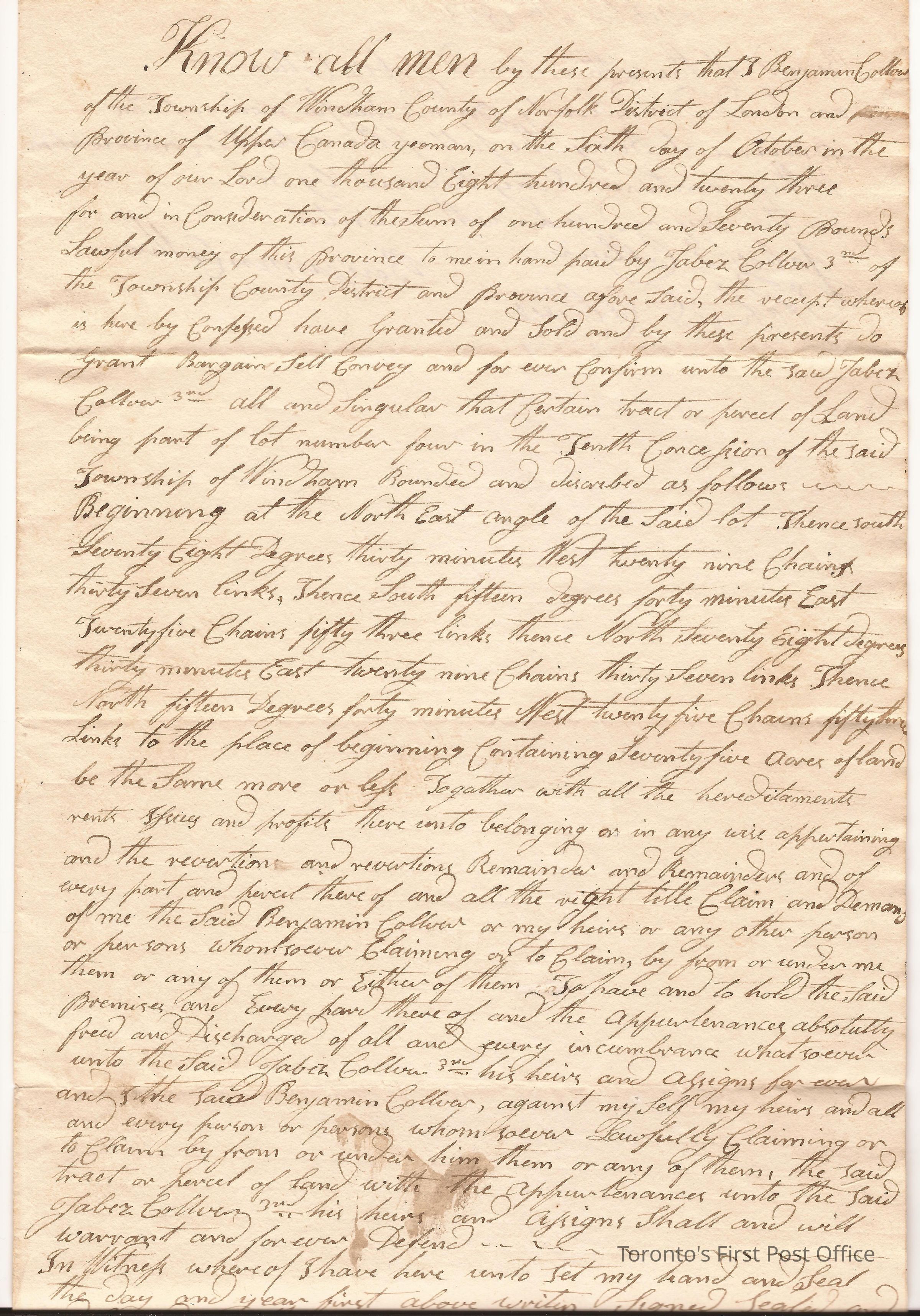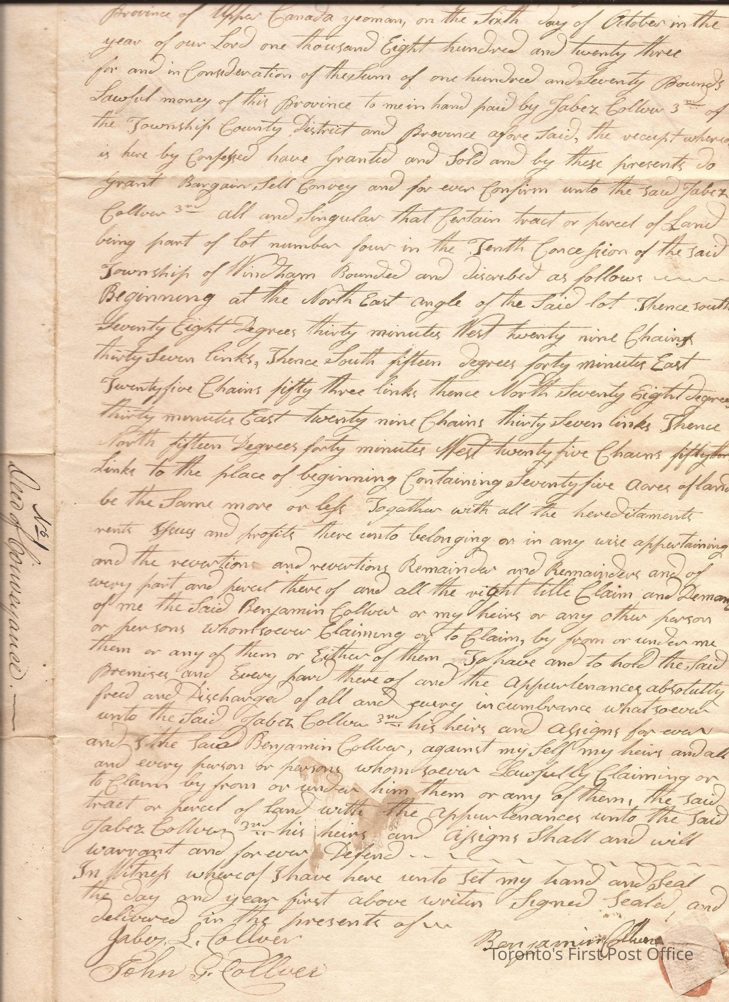 Deed of conveyance of 75 acres in Windham, north part of Lot No 4 in 10th Concession; from Benjamin Collver to Jabez(?) Collver; received £170 for property; registered by F.S. Walsh on 14th June 1836; black ink manuscript; red wafer seal at bottom right and covered in paper.Dimensions