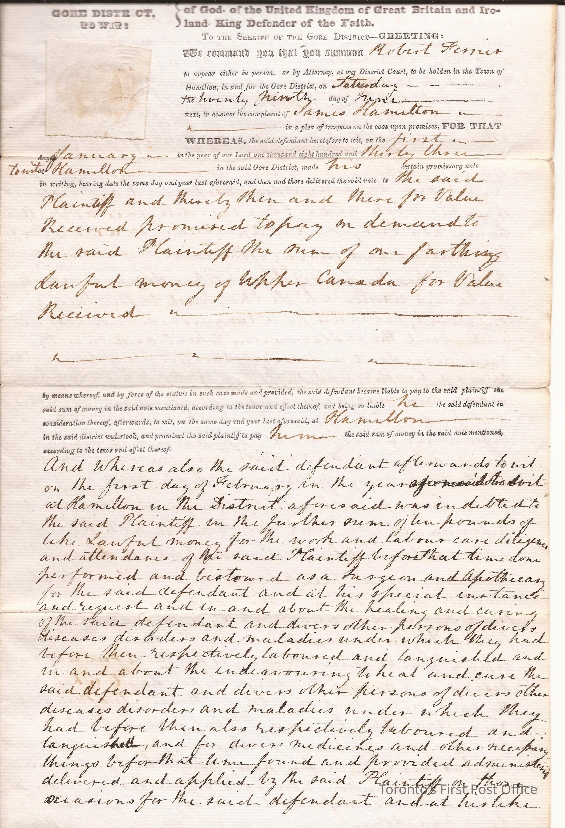 Court document/declaration; print and manuscript; black ink; dated Gore District, Hamilton, 29 June 1823; re: James Hamilton vs. Robert Ferrier and fees owing for medical services; signed by Lewis Graham, clerk; affidavit taken by Walter(?) A. Dickson; also signed by John D. Hatt, Plaintiff's Attorney; wafer seal at top left corner covered with paper.Dimensions