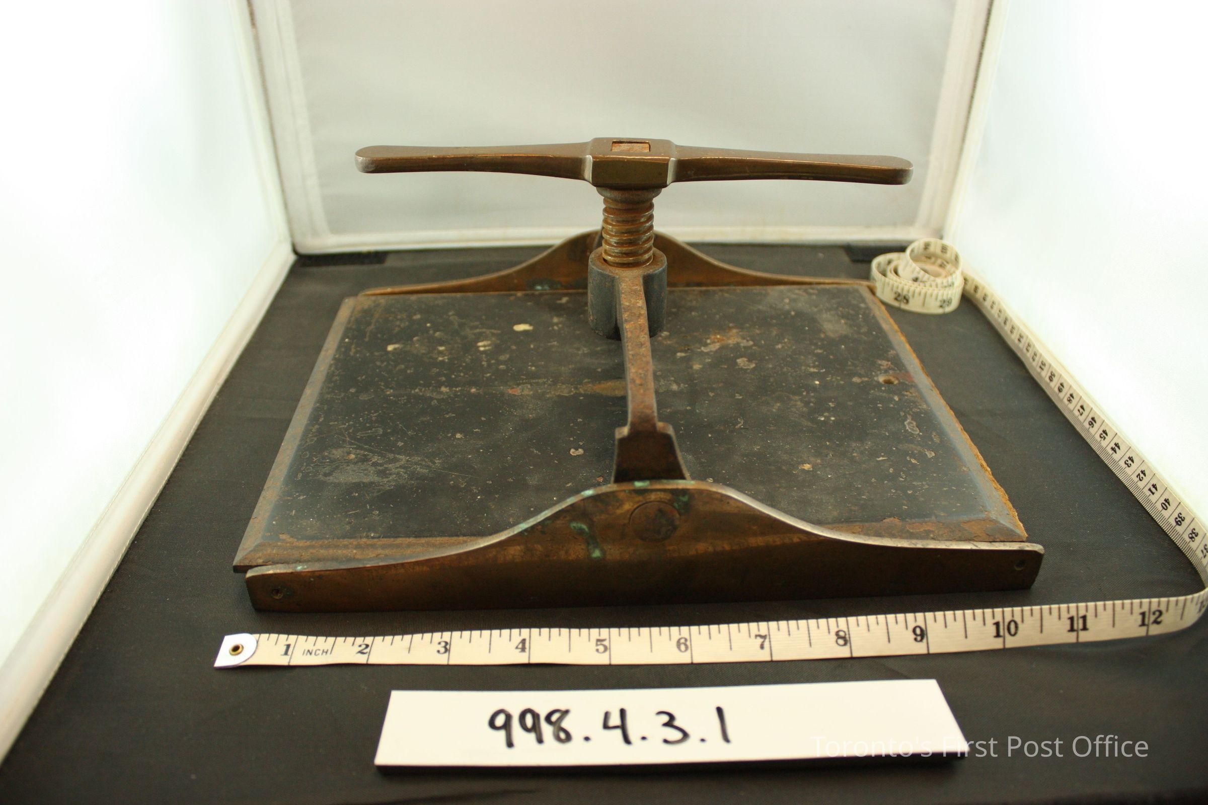 Book press; flat bottom attached to raised sides which meet at centre of press and ending with a wing nut and screw mechanism; top plate is cast iron; two felt covered cardboard pieces between plates.Dimensions