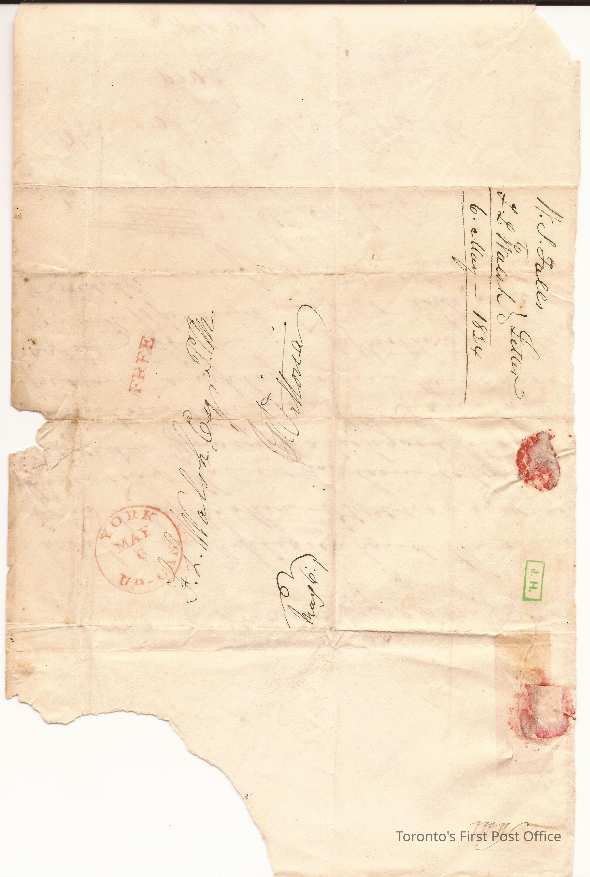 Letter to F.L Walsh, P.M. Vittoria; from W.J. Falls, Toronto; dated May 6, 1834; re: Falls asking Walsh to pass enclosed note on to Oliver (Falls' brother); free postage; black ink on unbleached paper; two red wafer seals.Dimensions