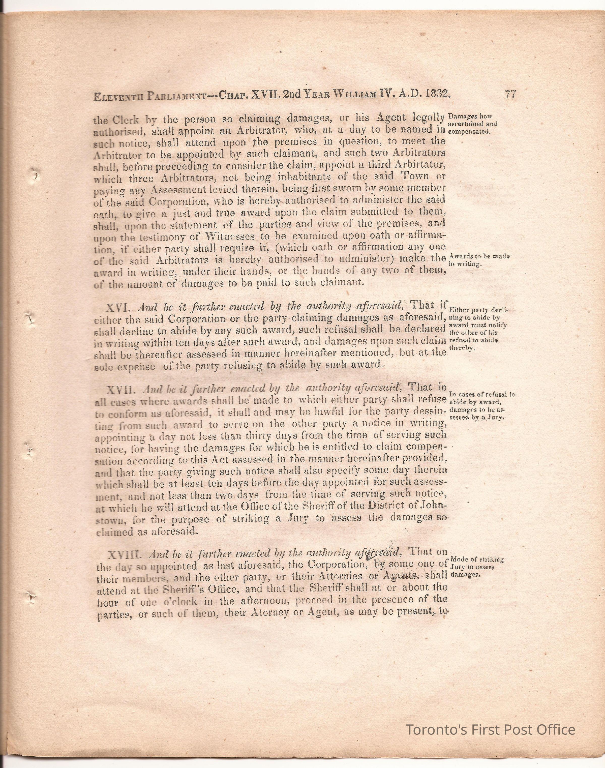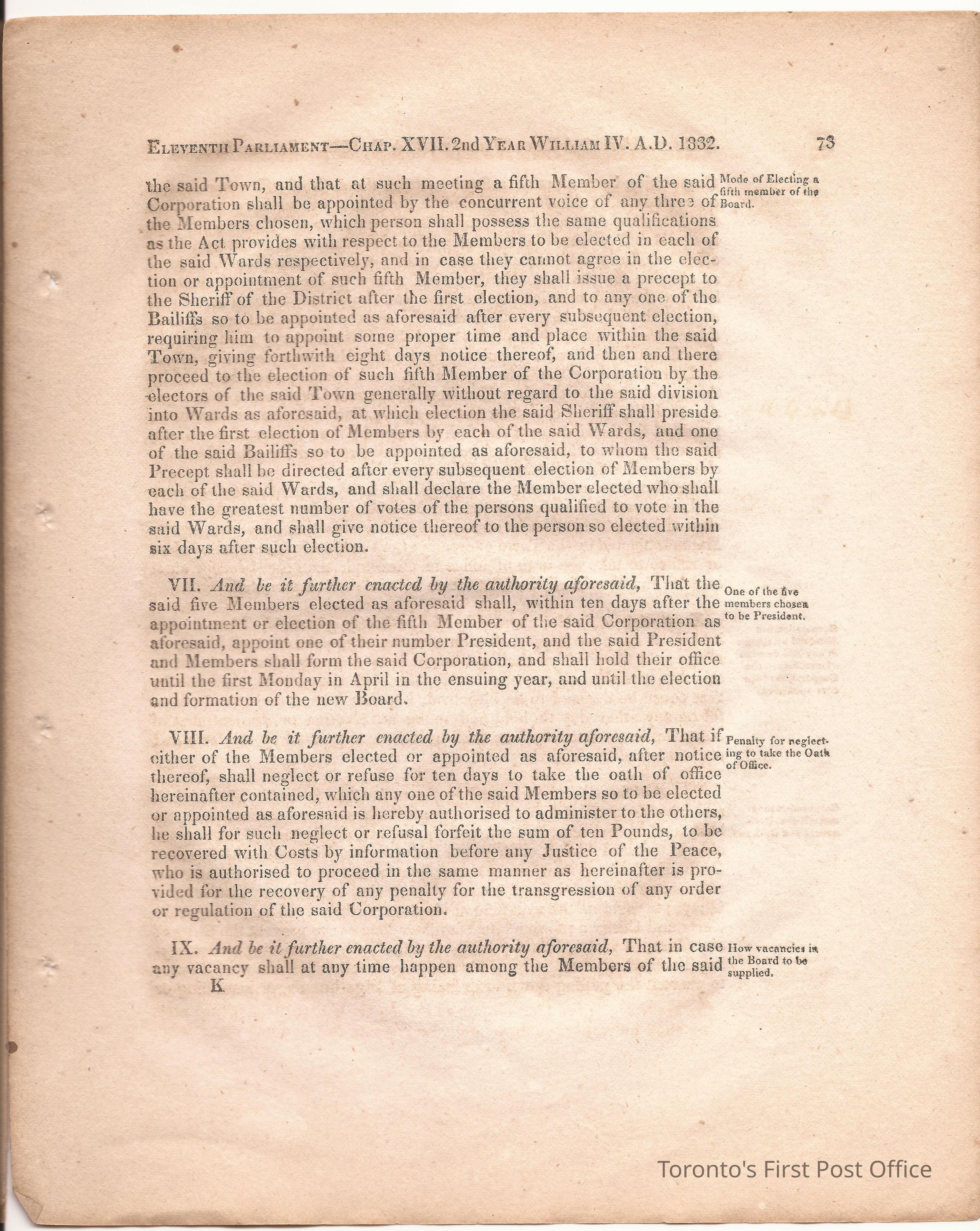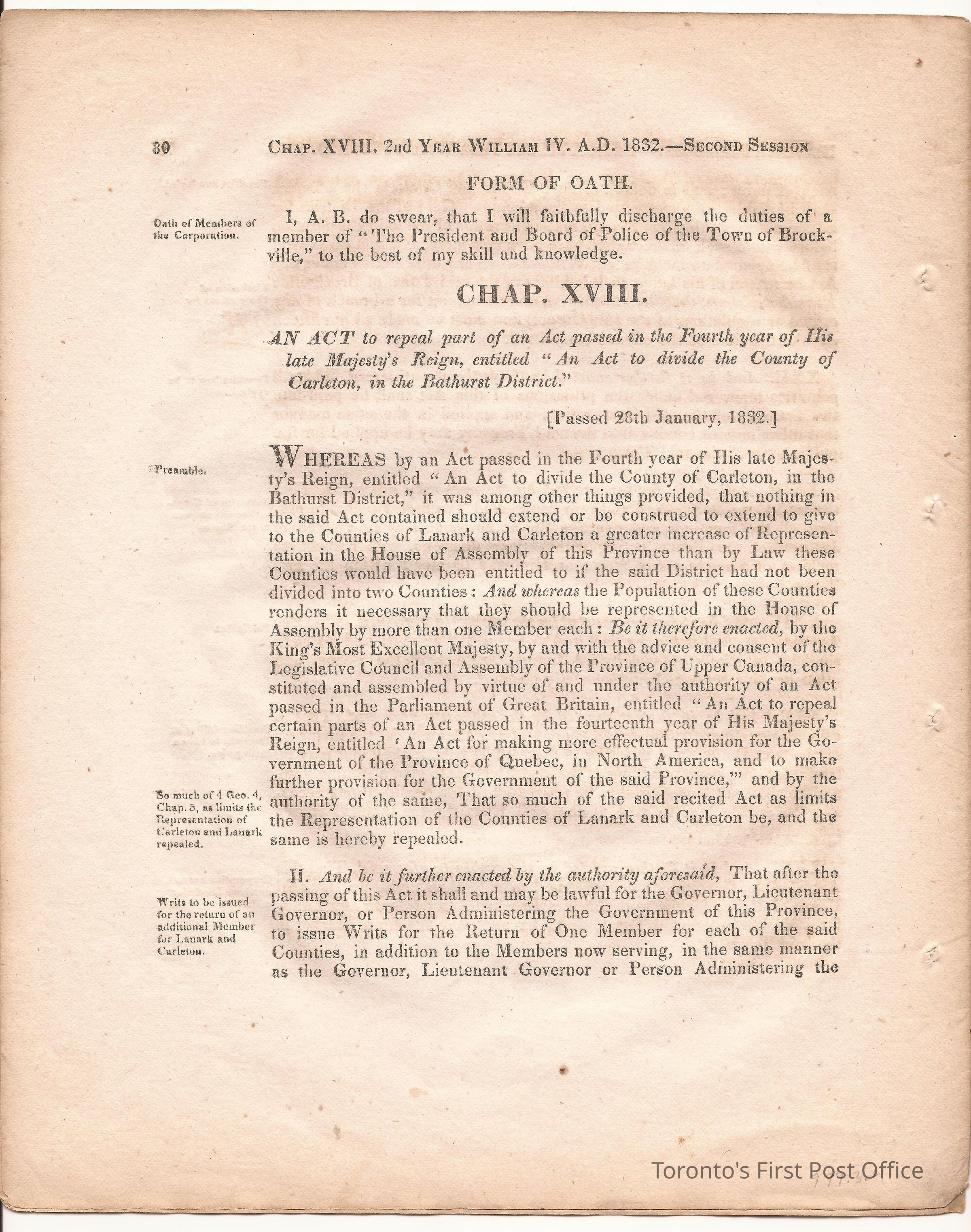 Statute; chapter XVII "An Act to establish a Police in the Town of Brockville in the District of Johnstown"; passed 28 Jan 1832; pages 71-80 (part of larger book); was cotton bound, now loose.Dimensions