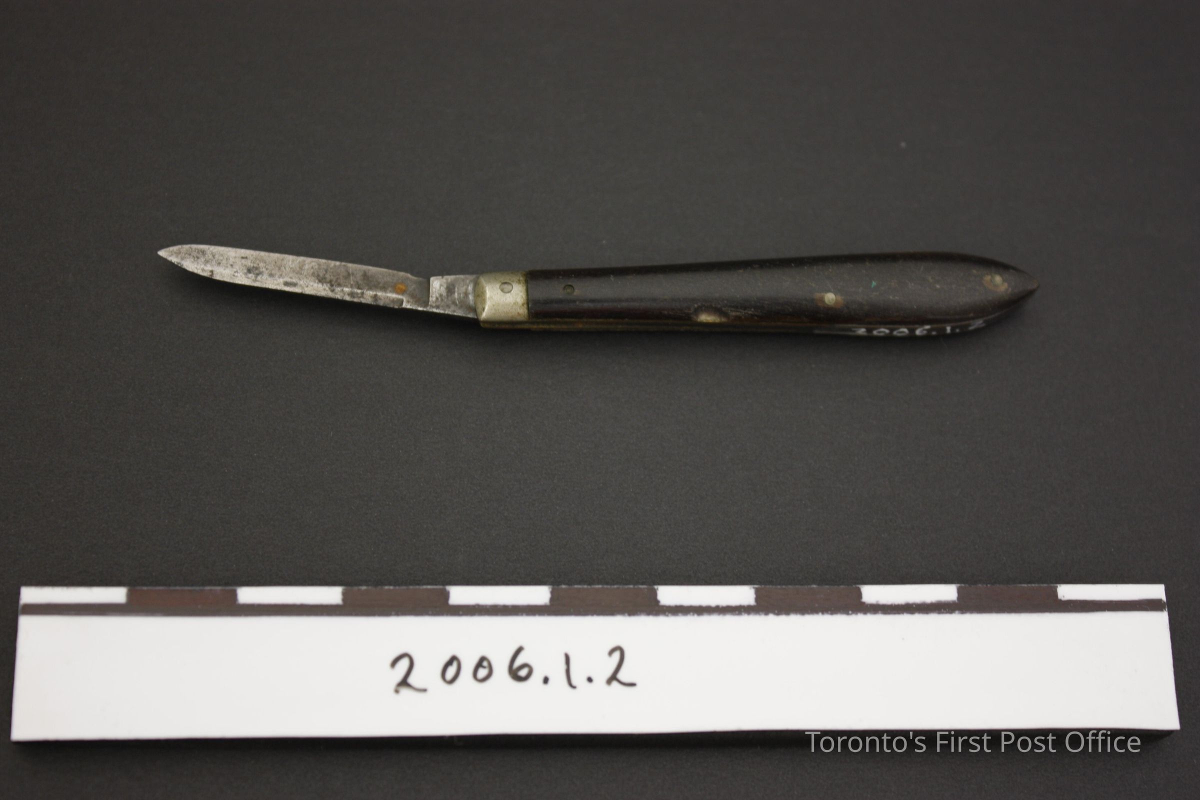 Pen knife with rosewood sides; four pins; yellow metal tip; one steel blade; elongated teardrop shape; circa 1830.Dimensions