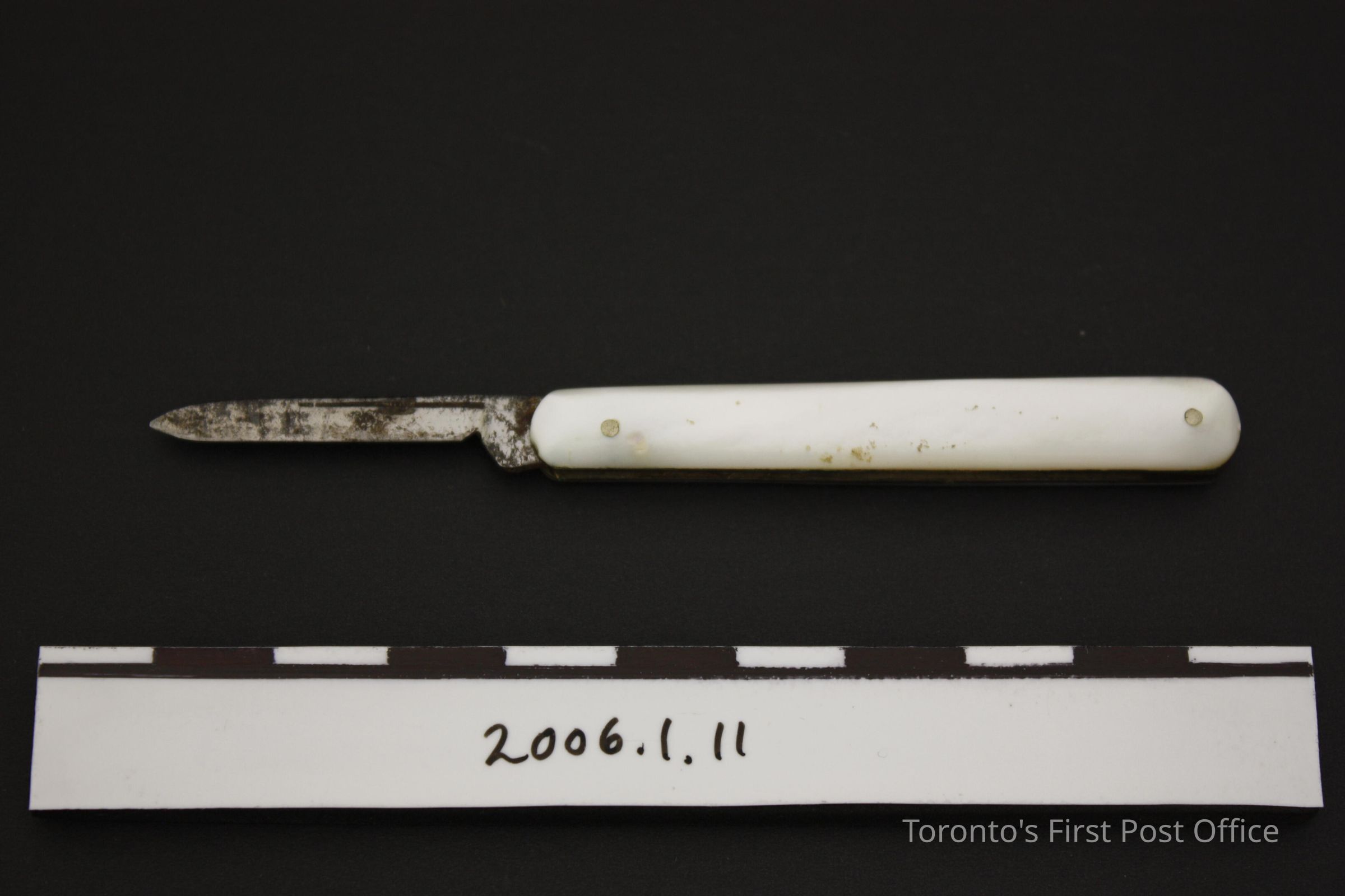 Pen knife with mother-of-pearl sides; steel blade; two pins on each side; illegible stamp at base of blade; in case with separate lid; cardboard covered with chesnut brown-black leather; "UNDERWOOD CUTLER 56, HAYMARKET LONDON" stamped in gold on base under lid; circa 1856-1860.Dimensions